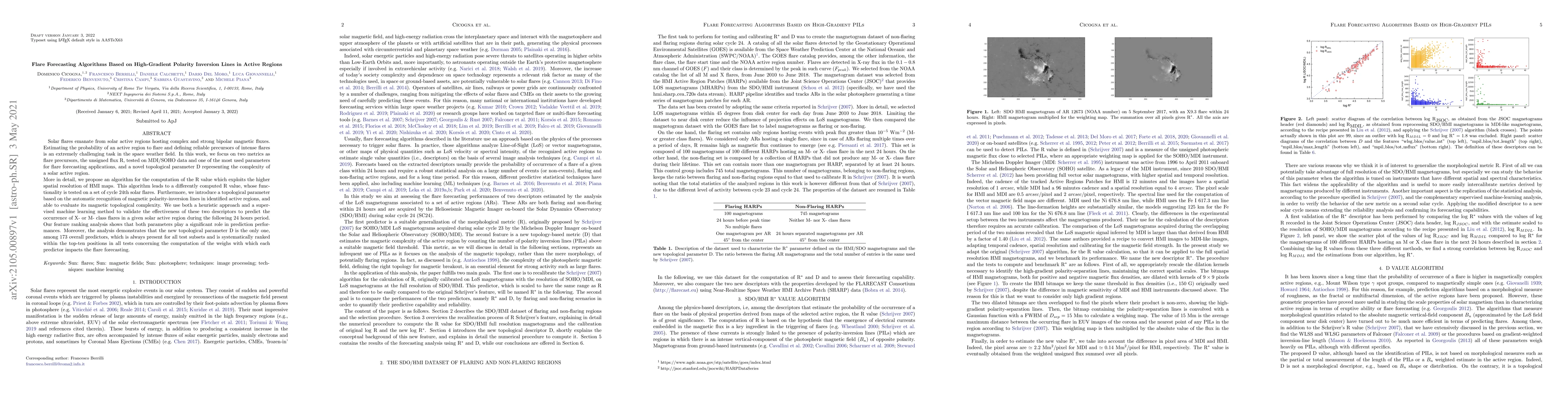 This paper proposes new algorithms for forecasting solar flares based on high-gradient polarity inversion lines in active regions. It introduces two metrics: the revised unsigned flux R and a novel topological parameter D, which measures magnetic complexity. Both metrics are validated using machine learning methods to predict X- or M-class flares, showing that the topological parameter D consistently ranks highly in predictive performance.
