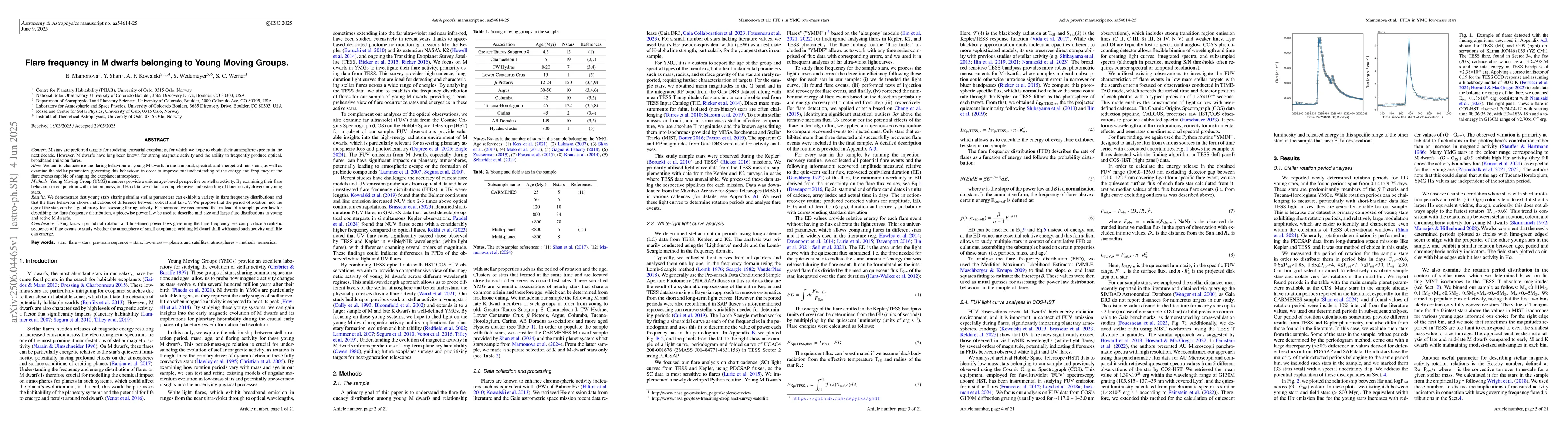 Context. M stars are preferred targets for studying terrestrial exoplanets, for which we hope to obtain their atmosphere spectra in the next decade. However, M dwarfs have long been known for strong magnetic activity and the ability to frequently produce optical, broadband emission flares. Aims. We aim to characterise the flaring behaviour of young M dwarfs in the temporal, spectral, and energetic dimensions, as well as examine the stellar parameters governing this behaviour, in order to improve our understanding of the energy and frequency of the flare events capable of shaping the exoplanet atmosphere. Methods. Young Moving Group (YMG) members provide a unique age-based perspective on stellar activity. By examining their flare behaviour in conjunction with rotation, mass, and H{\alpha} data, we obtain a comprehensive understanding of flare activity drivers in young stars. Results. We demonstrate that young stars sharing similar stellar parameters can exhibit a variety in flare frequency distributions and that the flare behaviour shows indications of difference between optical and far-UV. We propose that the period of rotation, not the age of the star, can be a good proxy for assessing flaring activity. Furthermore, we recommend that instead of a simple power law for describing the flare frequency distribution, a piecewise power law be used to describe mid-size and large flare distributions in young and active M dwarfs. Conclusions. Using known periods of rotation and fine-tuned power laws governing the flare frequency, we can produce a realistic sequence of flare events to study whether the atmosphere of small exoplanets orbiting M dwarf shall withstand such activity until life can emerge.