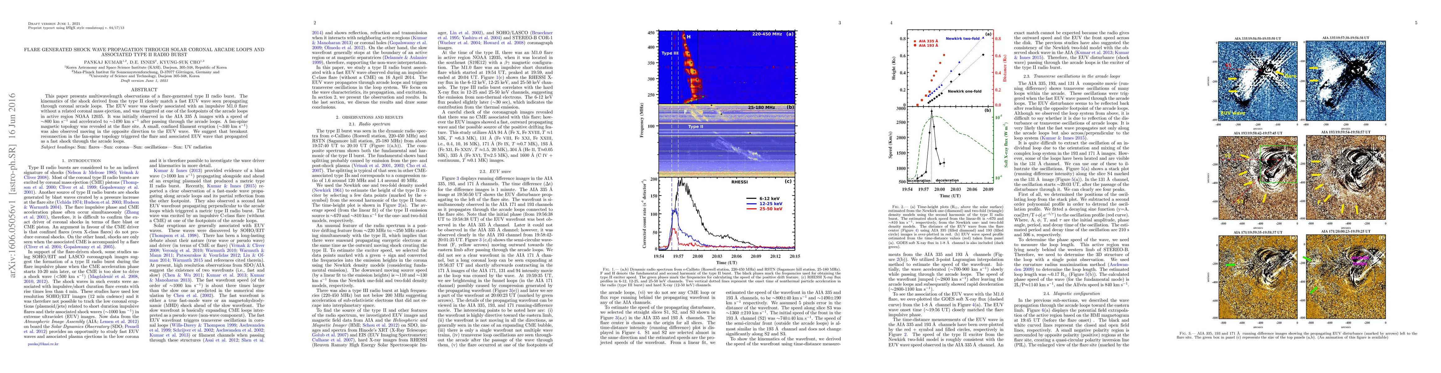 This study investigates a flare-generated type II radio burst and its associated shock wave, revealing a fast EUV wave propagating through coronal arcade loops at speeds up to 1490 km/s. The shock wave's kinematics closely match the EUV wave, suggesting breakout reconnection in a fan-spine magnetic topology triggered the event.