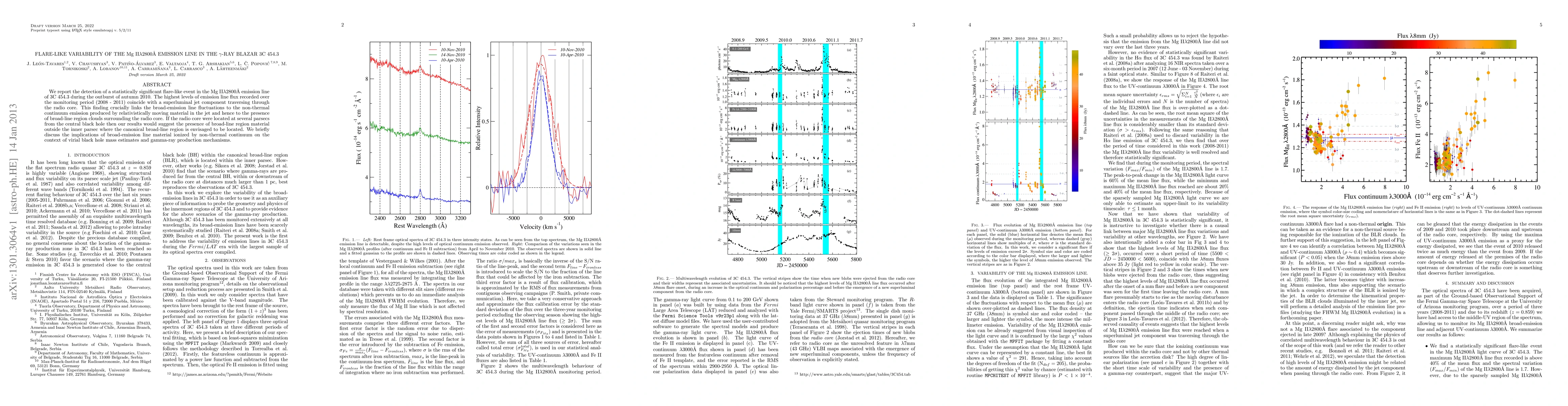 The research detected a significant flare in the Mg II emission line of blazar 3C 454.3 during its 2010 outburst, coinciding with a jet component passing through the radio core. This suggests broad-line region material could exist beyond the inner parsec, impacting virial BH mass estimates and gamma-ray production mechanisms.