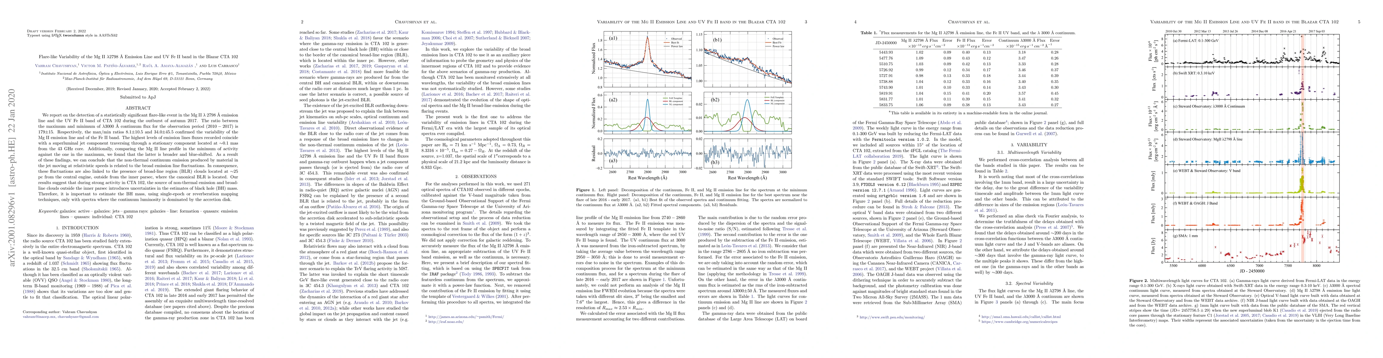 We report on the detection of a statistically significant flare-like event in the Mg~II~$\lambda$ 2798~\AA\ emission line and the UV~Fe~II band of CTA~102 during the outburst of autumn 2017. The ratio between the maximum and minimum of $\lambda$3000~\AA\ continuum flux for the observation period ($2010-2017$) is 179$\pm$15. Respectively, the max/min ratios 8.1$\pm$10.5 and 34.0$\pm$45.5 confirmed the variability of the Mg~II emission line and of the Fe~II band. The highest levels of emission lines fluxes recorded coincide with a superluminal jet component traversing through a stationary component located at $\sim$0.1 mas from the 43 GHz core. Additionally, comparing the Mg~II line profile in the minimum of activity against the one in the maximum, we found that the latter is broader and blue-shifted. As a result of these findings, we can conclude that the non-thermal continuum emission produced by material in the jet moving at relativistic speeds is related to the broad emission line fluctuations. In consequence, these fluctuations are also linked to the presence of broad-line region (BLR) clouds located at $\sim$25 pc from the central engine, outside from the inner parsec, where the canonical BLR is located. Our results suggest that during strong activity in CTA~102, the source of non-thermal emission and broad-line clouds outside the inner parsec introduces uncertainties in the estimates of black hole (BH) mass. Therefore, it is important to estimate the BH mass, using single-epoch or reverberation mapping techniques, only with spectra where the continuum luminosity is dominated by the accretion disk.