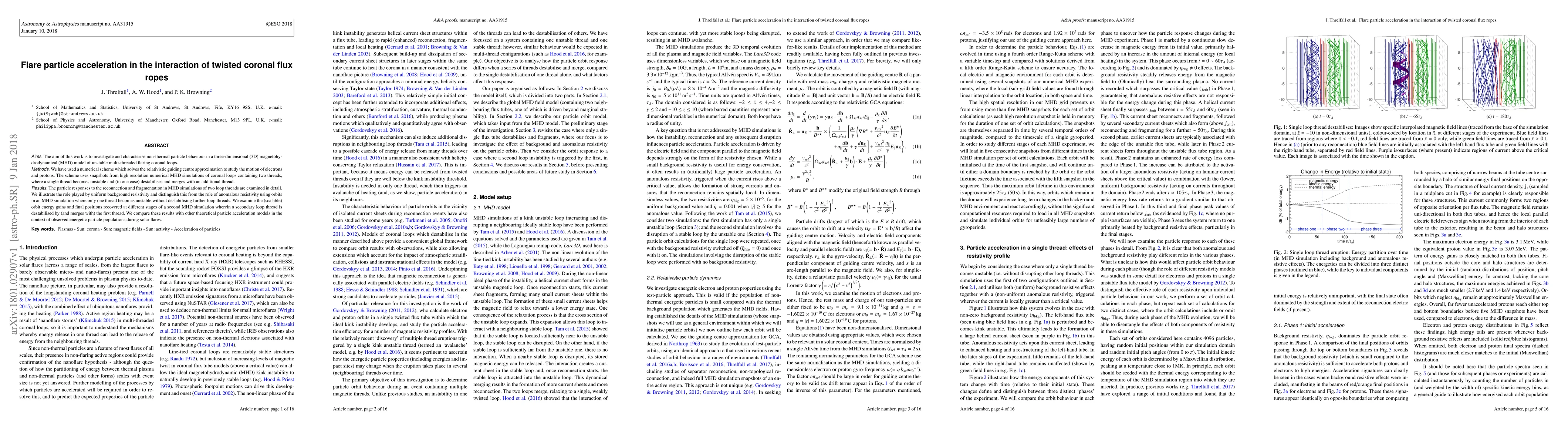 The aim of this work is to investigate and characterise non-thermal particle behaviour in a three-dimensional (3D) magnetohydrodynamical (MHD) model of unstable multi-threaded flaring coronal loops. We have used a numerical scheme which solves the relativistic guiding centre approximation to study the motion of electrons and protons. The scheme uses snapshots from high resolution numerical MHD simulations of coronal loops containing two threads, where a single thread becomes unstable and (in one case) destabilises and merges with an additional thread. The particle responses to the reconnection and fragmentation in MHD simulations of two loop threads are examined in detail. We illustrate the role played by uniform background resistivity and distinguish this from the role of anomalous resistivity using orbits in an MHD simulation where only one thread becomes unstable without destabilising further loop threads. We examine the (scalable) orbit energy gains and final positions recovered at different stages of a second MHD simulation wherein a secondary loop thread is destabilised by (and merges with) the first thread. We compare these results with other theoretical particle acceleration models in the context of observed energetic particle populations during solar flares.
