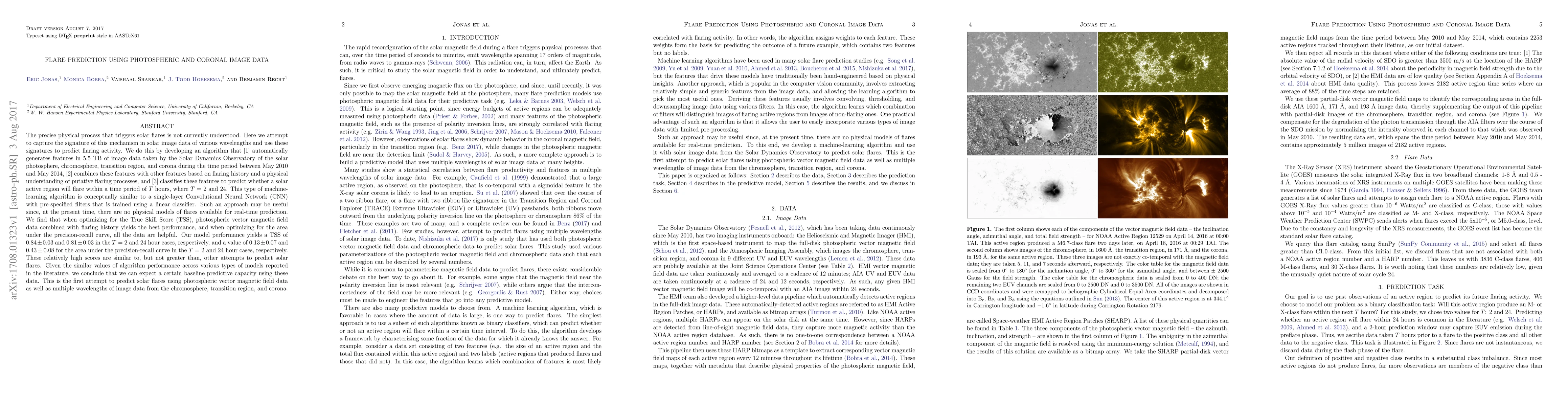 The precise physical process that triggers solar flares is not currently understood. Here we attempt to capture the signature of this mechanism in solar image data of various wavelengths and use these signatures to predict flaring activity. We do this by developing an algorithm that [1] automatically generates features in 5.5 TB of image data taken by the Solar Dynamics Observatory of the solar photosphere, chromosphere, transition region, and corona during the time period between May 2010 and May 2014, [2] combines these features with other features based on flaring history and a physical understanding of putative flaring processes, and [3] classifies these features to predict whether a solar active region will flare within a time period of $T$ hours, where $T$ = 2 and 24. We find that when optimizing for the True Skill Score (TSS), photospheric vector magnetic field data combined with flaring history yields the best performance, and when optimizing for the area under the precision-recall curve, all the data are helpful. Our model performance yields a TSS of $0.84 \pm 0.03$ and $0.81 \pm 0.03$ in the $T$ = 2 and 24 hour cases, respectively, and a value of $0.13 \pm 0.07$ and $0.43 \pm 0.08$ for the area under the precision-recall curve in the $T$ = 2 and 24 hour cases, respectively. These relatively high scores are similar to, but not greater than, other attempts to predict solar flares. Given the similar values of algorithm performance across various types of models reported in the literature, we conclude that we can expect a certain baseline predictive capacity using these data. This is the first attempt to predict solar flares using photospheric vector magnetic field data as well as multiple wavelengths of image data from the chromosphere, transition region, and corona.