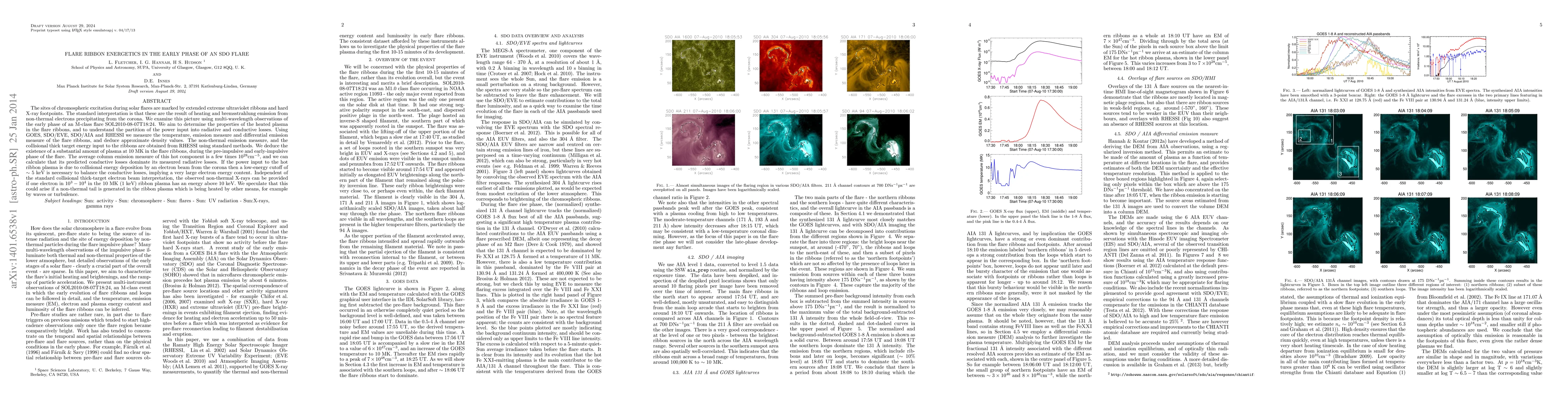 The sites of chromospheric excitation during solar flares are marked by extended extreme ultraviolet ribbons and hard X-ray footpoints. The standard interpretation is that these are the result of heating and bremsstrahlung emission from non-thermal electrons precipitating from the corona. We examine this picture using multi-wavelength observations of the early phase of an M-class flare SOL2010-08-07T18:24. We aim to determine the properties of the heated plasma in the flare ribbons, and to understand the partition of the power input into radiative and conductive losses. Using GOES, SDO/EVE, SDO/AIA and RHESSI we measure the temperature, emission measure and differential emission measure of the flare ribbons, and deduce approximate density values. The non-thermal emission measure, and the collisional thick target energy input to the ribbons are obtained from RHESSI using standard methods. We deduce the existence of a substantial amount of plasma at 10 MK in the flare ribbons, during the pre-impulsive and early-impulsive phase of the flare. The average column emission measure of this hot component is a few times 10^28/cm^5, and we can calculate that its predicted conductive losses dominate its measured radiative losses. If the power input to the hot ribbon plasma is due to collisional energy deposition by an electron beam from the corona then a low-energy cutoff of around 5 keV is necessary to balance the conductive losses, implying a very large electron energy content. Independent of the standard collisional thick-target electron beam interpretation, the observed non-thermal X-rays can be provided if one electron in 10^3 - 10^4 in the 10 MK (1 keV) ribbon plasma has an energy above 10 keV. We speculate that this could arise if a non-thermal tail is generated in the ribbon plasma which is being heated by other means, for example by waves or turbulence.