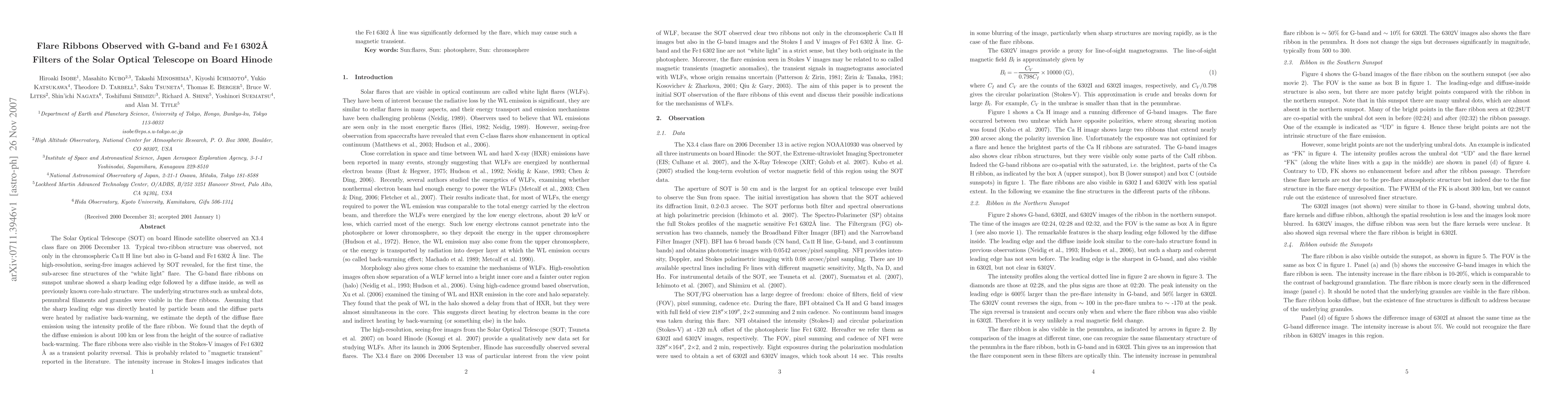 The Hinode satellite's Solar Optical Telescope observed an X3.4 class flare, revealing fine structures of flare ribbons in G-band and FeI 6302A lines, including sharp leading edges and diffuse interiors. The study estimates the depth of diffuse flare emission to be around 100 km.