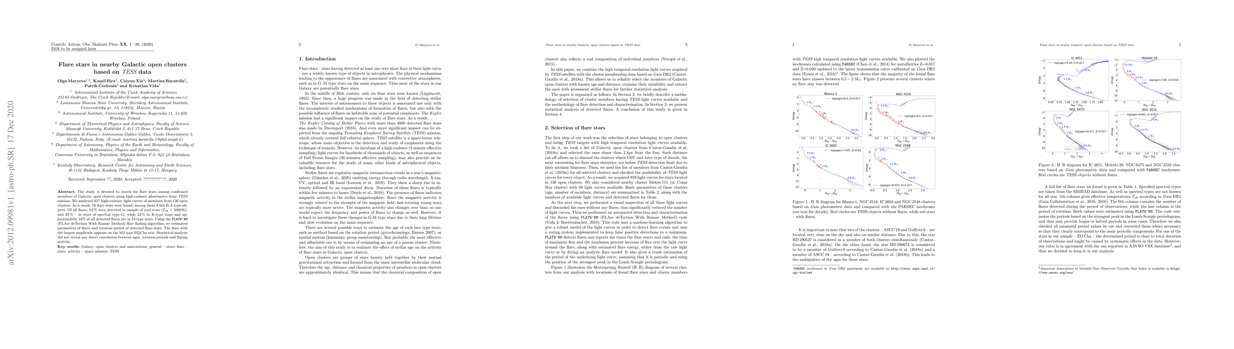 This study identifies flare stars in nearby Galactic open clusters using {\it TESS} data, finding 56 flare stars among 957 high-cadence light curves from 136 clusters. The majority of flares were detected in cool stars (63%), with notable occurrences in G-type (29%) and M-type (34%) stars. No direct correlation was found between flare activity and age or rotation period.