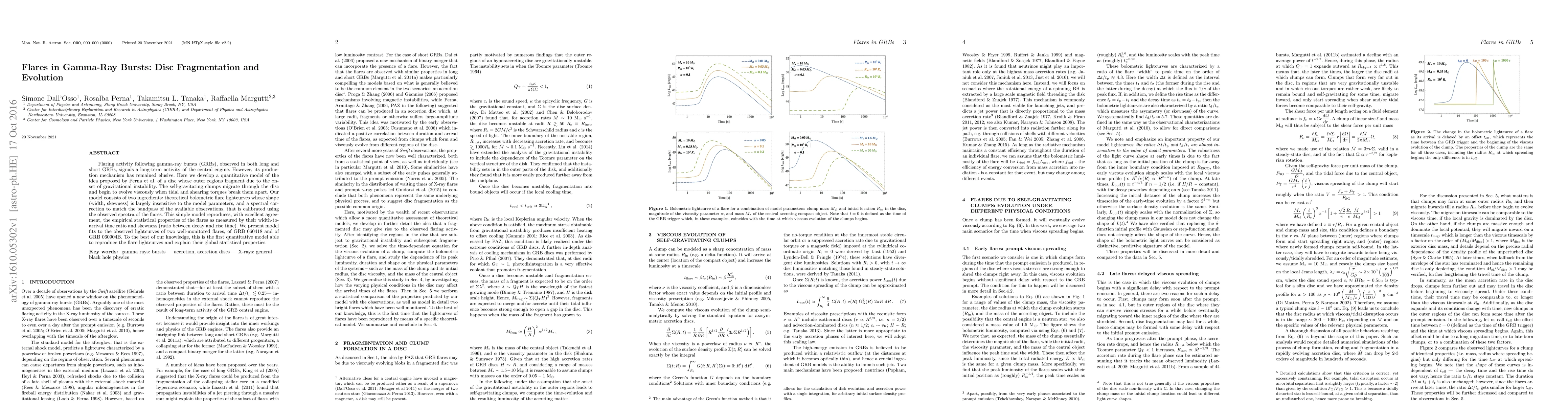 Flaring activity following gamma-ray bursts (GRBs), observed in both long and short GRBs, signals a long-term activity of the central engine. However, its production mechanism has remained elusive. Here we develop a quantitative model of the idea proposed by Perna et al. of a disc whose outer regions fragment due to the onset of gravitational instability. The self-gravitating clumps migrate through the disc and begin to evolve viscously when tidal and shearing torques break them apart. Our model consists of two ingredients: theoretical bolometric flare lightcurves whose shape (width, skewness) is largely insensitive to the model parameters, and a spectral correction to match the bandpass of the available observations, that is calibrated using the observed spectra of the flares. This simple model reproduces, with excellent agreement, the empirical statistical properties of the flares as measured by their width-to-arrival time ratio and skewness (ratio between decay and rise time). We present model fits to the observed lightcurves of two well-monitored flares, of GRB 060418 and of GRB 060904B. To the best of our knowledge, this is the first quantitative model able to reproduce the flare lightcurves and explain their global statistical properties.