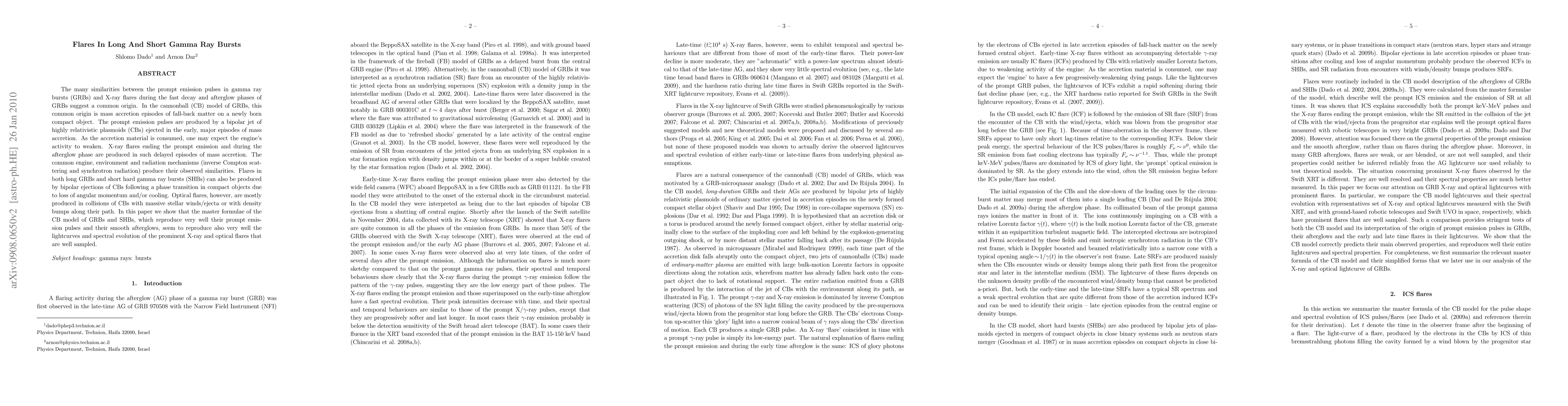 The many similarities between the prompt emission pulses in gamma ray bursts (GRBs) and X-ray flares during the fast decay and afterglow phases of GRBs suggest a common origin. In the cannonball (CB) model of GRBs, this common origin is mass accretion episodes of fall-back matter on a newly born compact object. The prompt emission pulses are produced by a bipolar jet of highly relativistic plasmoids (CBs) ejected in the early, major episodes of mass accretion. As the accretion material is consumed, one may expect the engine's activity to weaken. X-ray flares ending the prompt emission and during the afterglow phase are produced in such delayed episodes of mass accretion. The common engine, environment and radiation mechanisms (inverse Compton scattering and synchrotron radiation) produce their observed similarities. Flares in both long GRBs and short hard gamma ray bursts (SHBs) can also be produced by bipolar ejections of CBs following a phase transition in compact objects due to loss of angular momentum and/or cooling. Optical flares, however, are mostly produced in collisions of CBs with massive stellar winds/ejecta or with density bumps along their path. In this paper we show that the master formulae of the CB model of GRBs and SHBs, which reproduce very well their prompt emission pulses and their smooth afterglows, seem to reproduce also very well the lightcurves and spectral evolution of the prominent X-ray and optical flares that are well sampled.