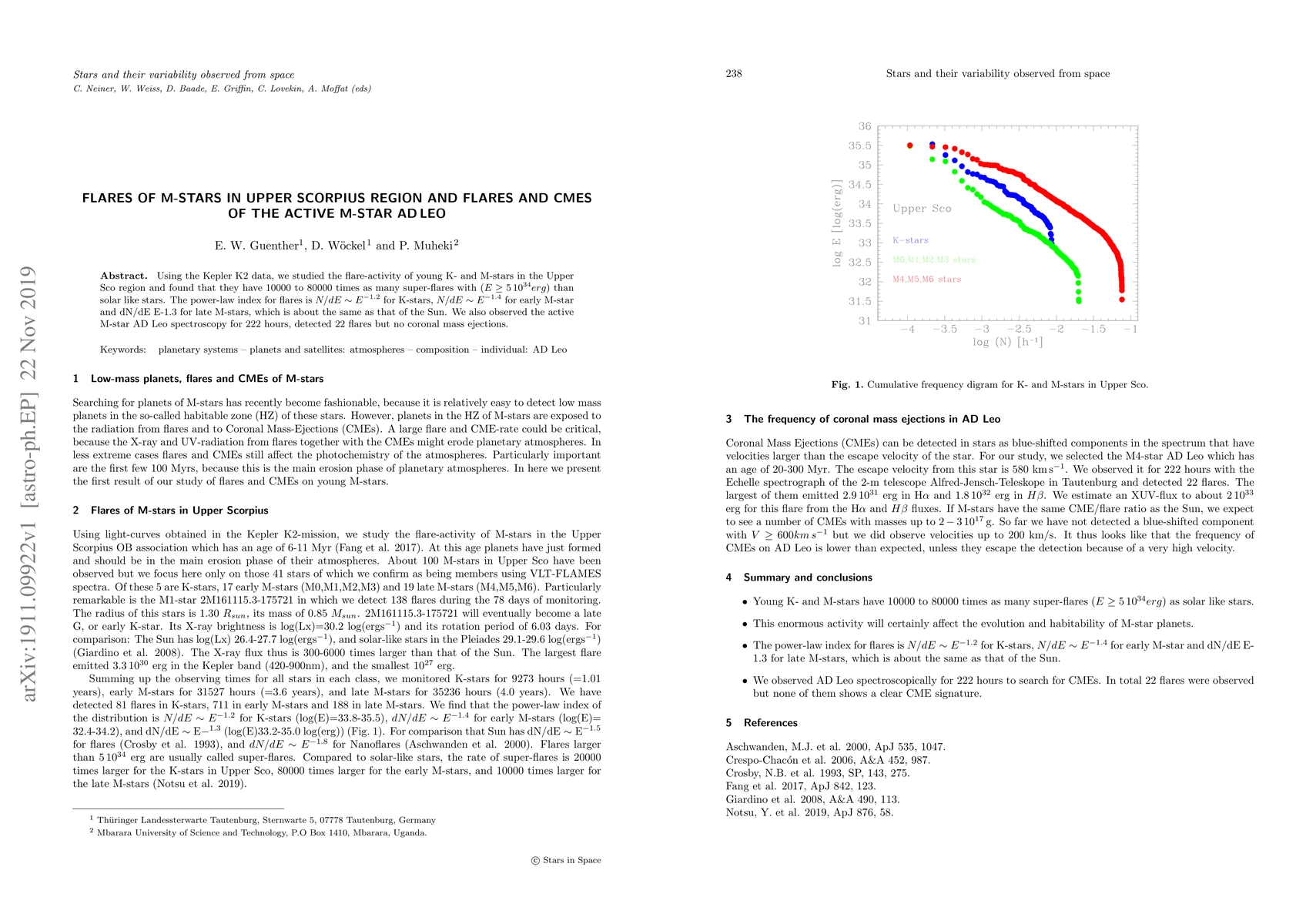 Summary: The study using Kepler K2 data reveals that young M-stars in the Upper Scorpius region exhibit significantly more super-flares than solar-like stars, with power-law indices varying by spectral type. Additionally, spectroscopic observations of AD Leo detected numerous flares but no coronal mass ejections.