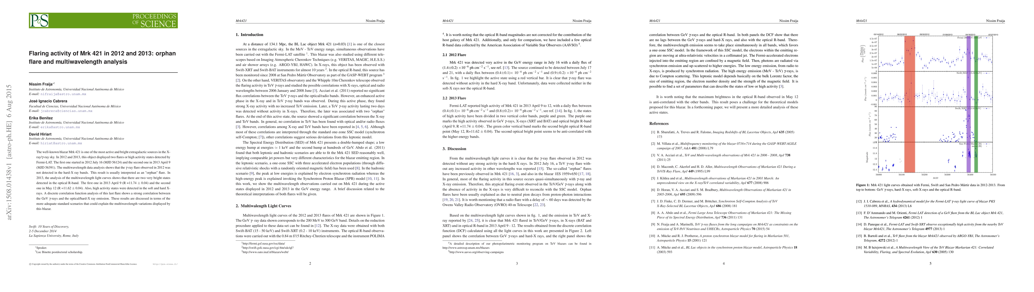 This paper analyzes the flaring activity of the blazar Mrk 421 in 2012 and 2013, identifying an "orphan" gamma-ray flare in 2012 that lacked hard-X ray detection, and two bright optical states in 2013 accompanied by high X-ray activity, with strong correlation between GeV gamma-rays and optical/hard-X ray emissions.