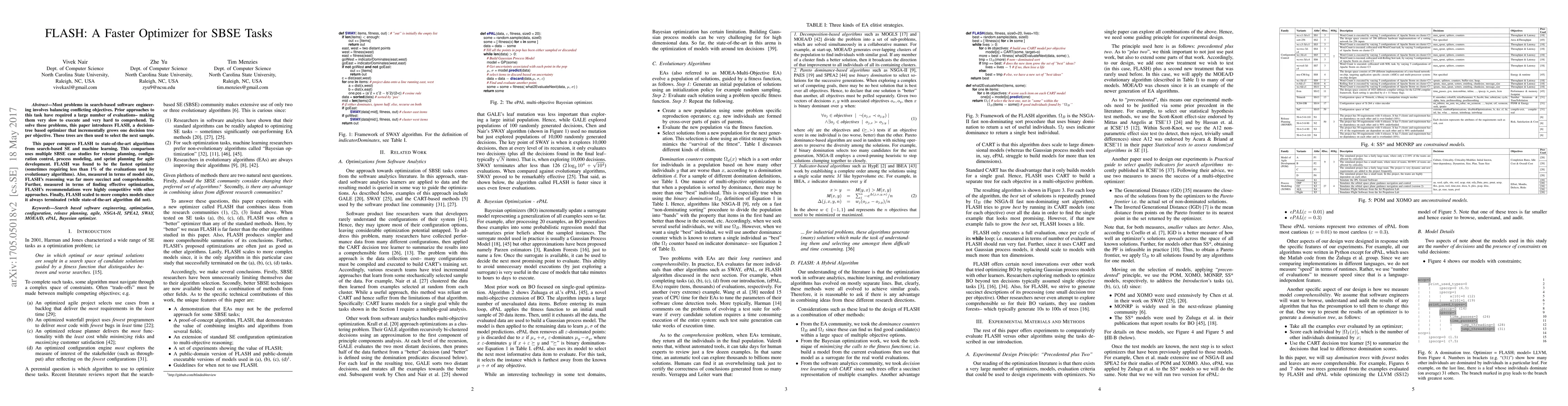 FLASH, a decision tree based optimizer, outperforms state-of-the-art algorithms in search-based software engineering tasks with fast execution times and succinct reasoning.