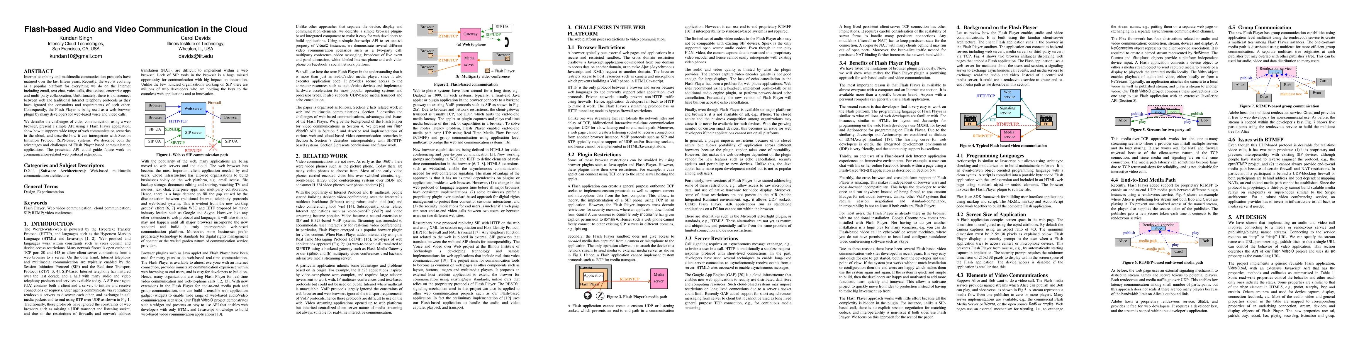 The paper discusses the use of Flash Player for web-based audio and video communication, highlighting its challenges and benefits in cloud environments, and its interoperability with SIP-based systems, while addressing the disconnect between web and traditional telephony protocols. The proposed Flash Player API aims to guide future web protocol developments for multimedia communication.
