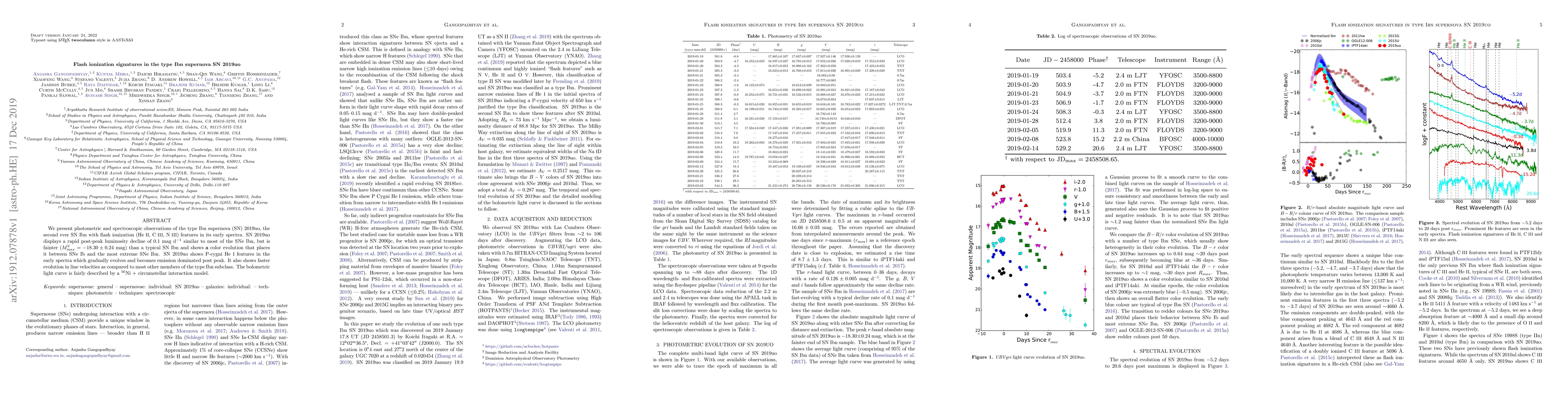This paper examines the type Ibn supernova SN 2019uo, noting its unique flash ionization features and rapid post-peak luminosity decline. The supernova is fainter than typical SNe Ibn and exhibits a blend of spectral characteristics between SNe Ib and extreme SNe Ibn.