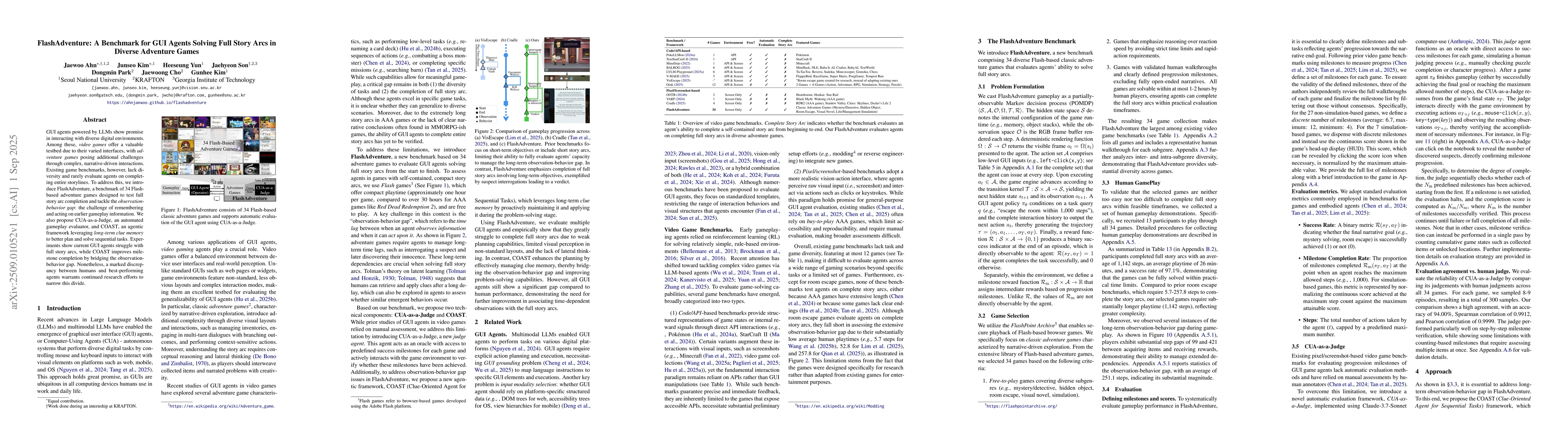 GUI agents powered by LLMs show promise in interacting with diverse digital environments. Among these, video games offer a valuable testbed due to their varied interfaces, with adventure games posing additional challenges through complex, narrative-driven interactions. Existing game benchmarks, however, lack diversity and rarely evaluate agents on completing entire storylines. To address this, we introduce FlashAdventure, a benchmark of 34 Flash-based adventure games designed to test full story arc completion and tackle the observation-behavior gap: the challenge of remembering and acting on earlier gameplay information. We also propose CUA-as-a-Judge, an automated gameplay evaluator, and COAST, an agentic framework leveraging long-term clue memory to better plan and solve sequential tasks. Experiments show current GUI agents struggle with full story arcs, while COAST improves milestone completion by bridging the observation-behavior gap. Nonetheless, a marked discrepancy between humans and best-performing agents warrants continued research efforts to narrow this divide.