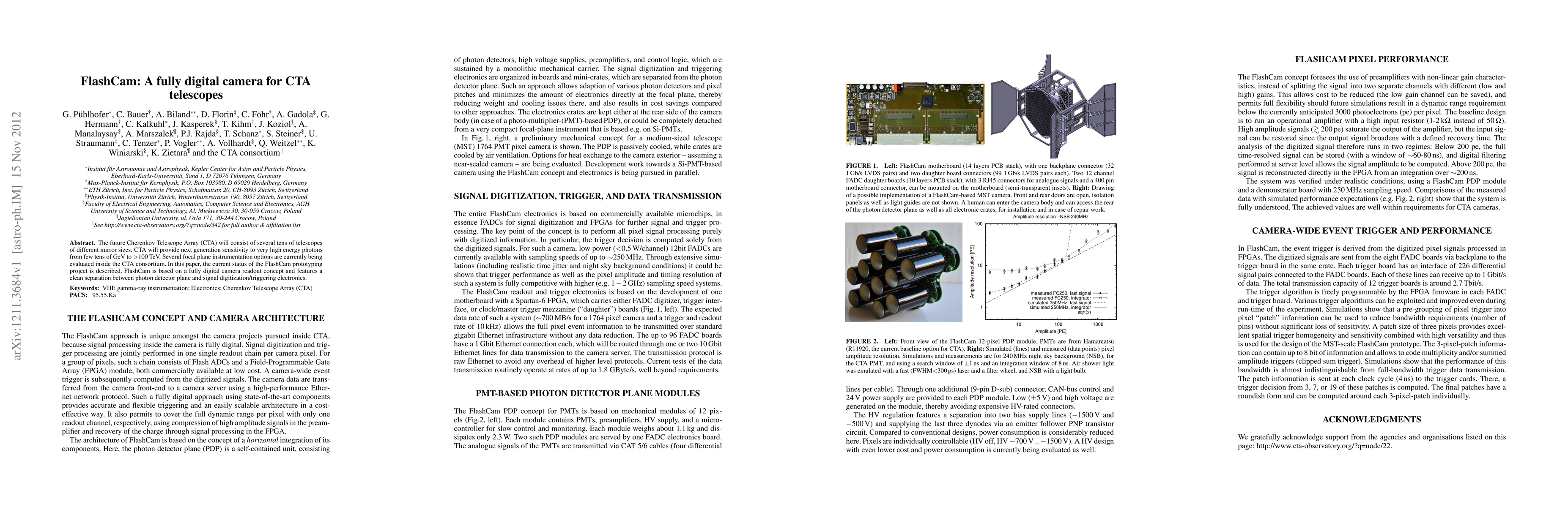 FlashCam is a fully digital camera prototype for the Cherenkov Telescope Array (CTA), designed to separate photon detection from signal digitization and triggering, aiming for next-generation sensitivity to high-energy photons. The project is currently in the prototyping phase.