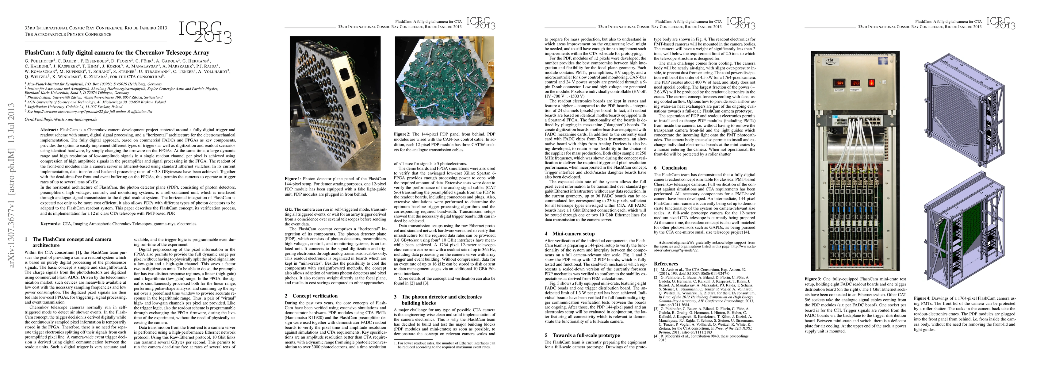 FlashCam is a fully digital Cherenkov camera designed for the Cherenkov Telescope Array, utilizing FPGAs and commercial FADCs for flexible trigger and readout. Its horizontal architecture allows for cost-effective integration and adaptability to different photon detectors, achieving high data transfer rates and enabling operation at trigger rates up to tens of kHz.