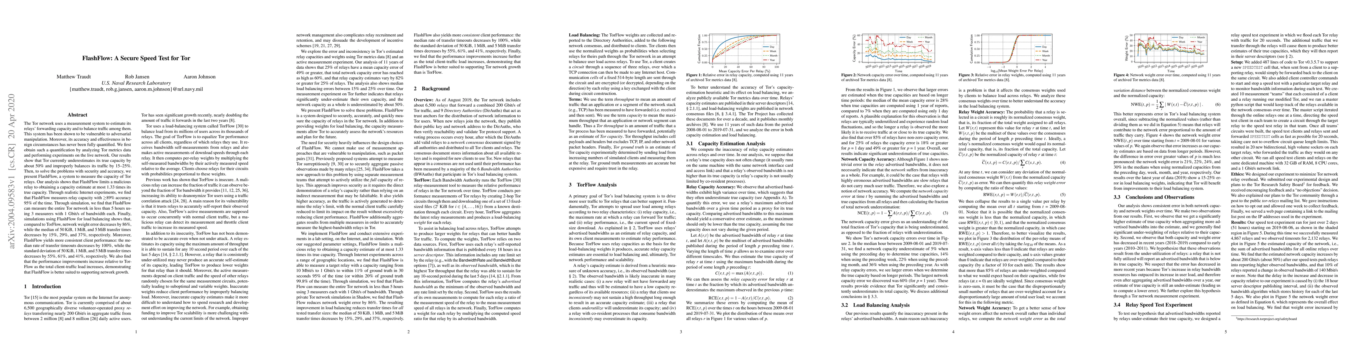 A new system called FlashFlow measures Tor relay capacity with high accuracy (89% of the time) and limits malicious relays to at most 1.33 times their true capacity.