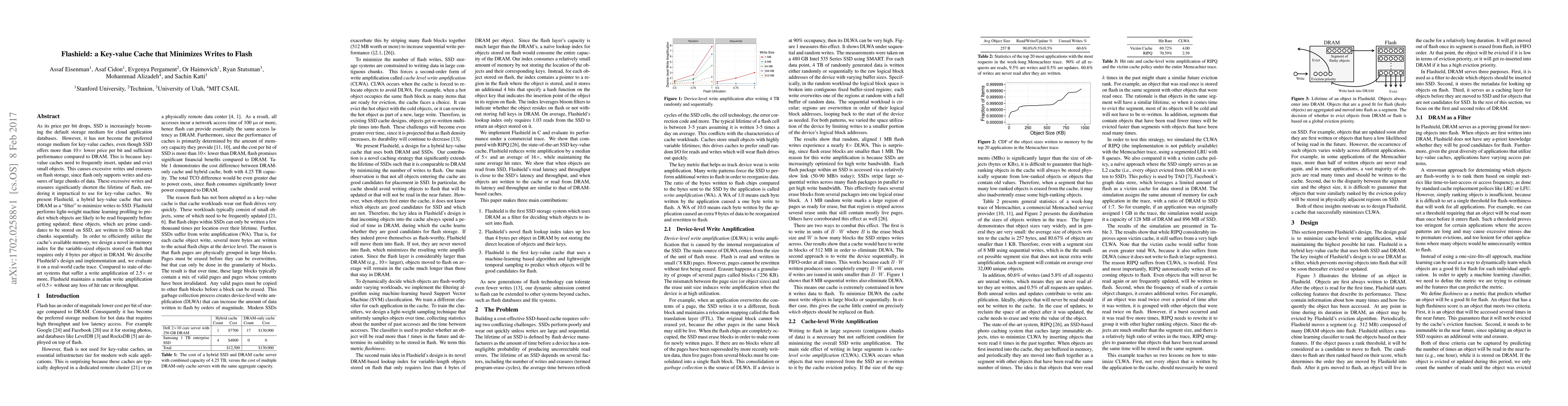 Flashield is a hybrid key-value cache that leverages DRAM to minimize excessive writes to SSD, addressing the challenge of frequent small object updates in key-value caches. It uses machine learning to predict and batch write large objects to SSD, achieving a median write amplification of 0.5x compared to 2.5x or more in state-of-the-art systems.
