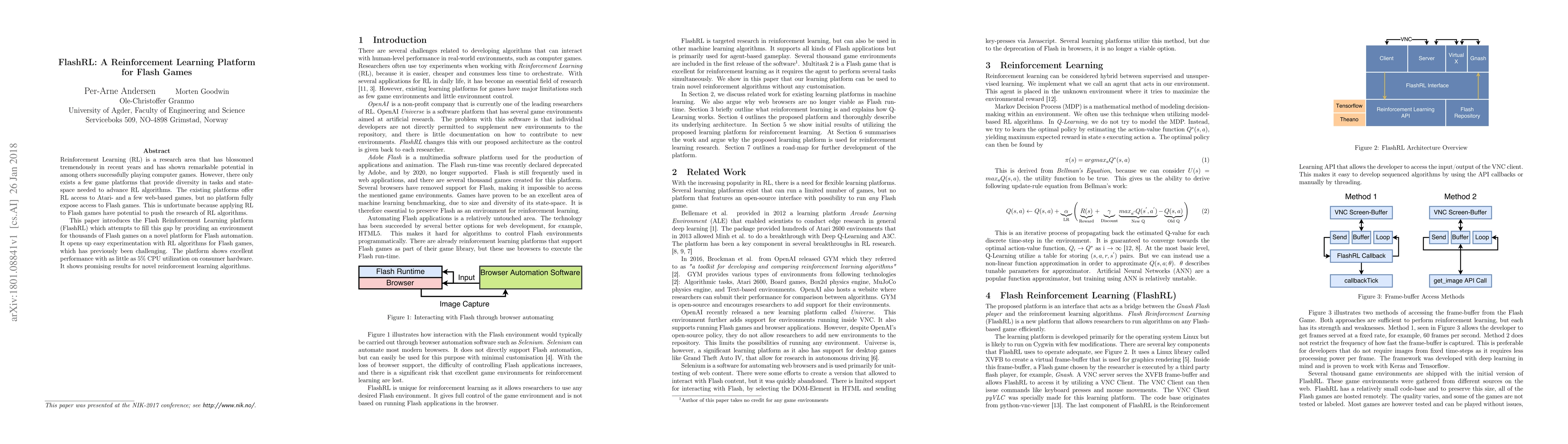 FlashRL is a new reinforcement learning platform designed to provide diverse Flash game environments for advancing RL algorithms. It enables easy experimentation with RL on Flash games, demonstrating excellent performance with minimal CPU usage on consumer hardware.
