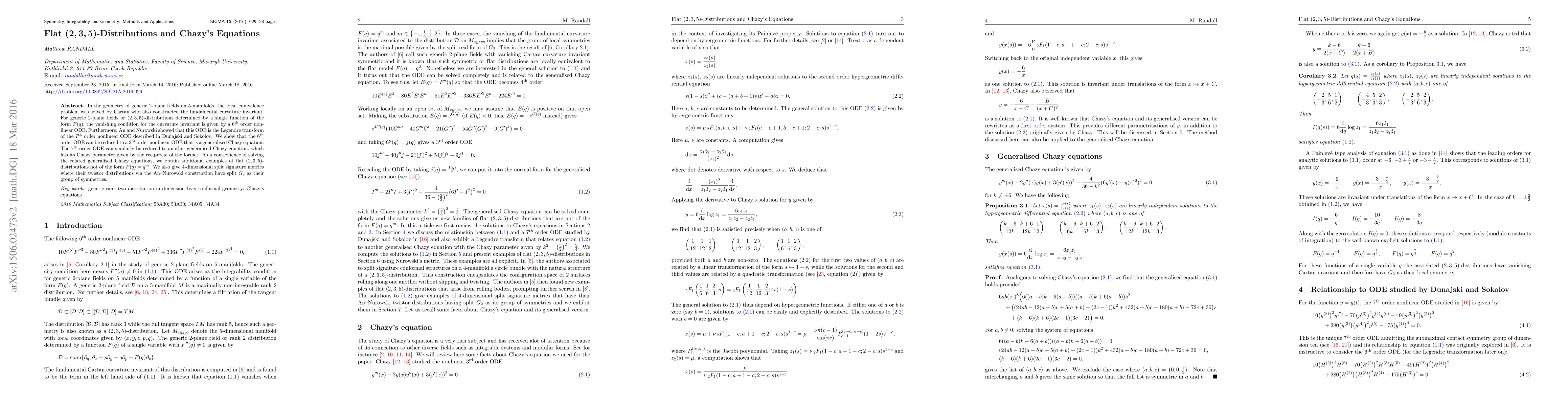 This paper solves the local equivalence problem for $(2,3,5)$-distributions on 5-manifolds by reducing the sixth-order nonlinear ODE from Cartan's curvature invariant to a generalised Chazy equation. It also reduces a seventh-order ODE to another generalised Chazy equation, providing new examples of flat distributions and 4D split signature metrics with $G_2$ symmetry.