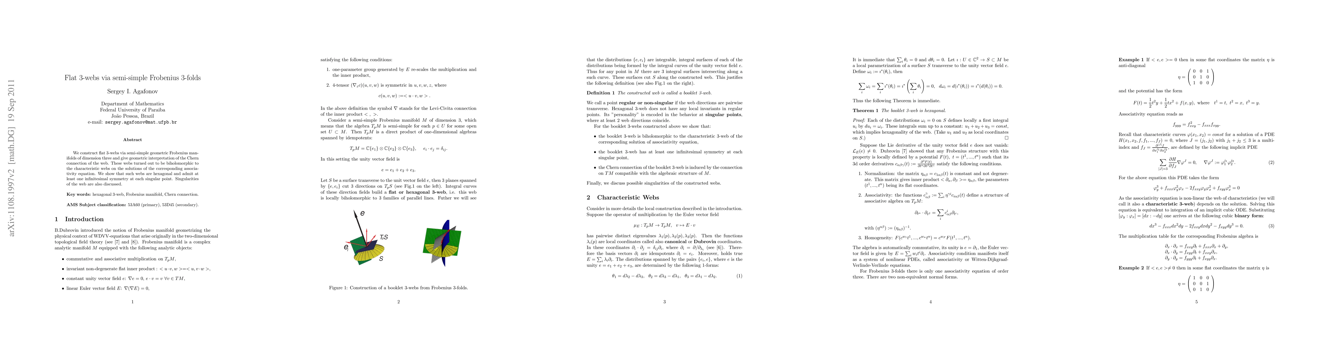This paper constructs flat 3-webs using semi-simple Frobenius 3-folds and provides a geometric interpretation of their Chern connection. The webs are shown to be biholomorphic to characteristic webs of associativity equations and exhibit hexagonal structures with infinitesimal symmetries at singularities.
