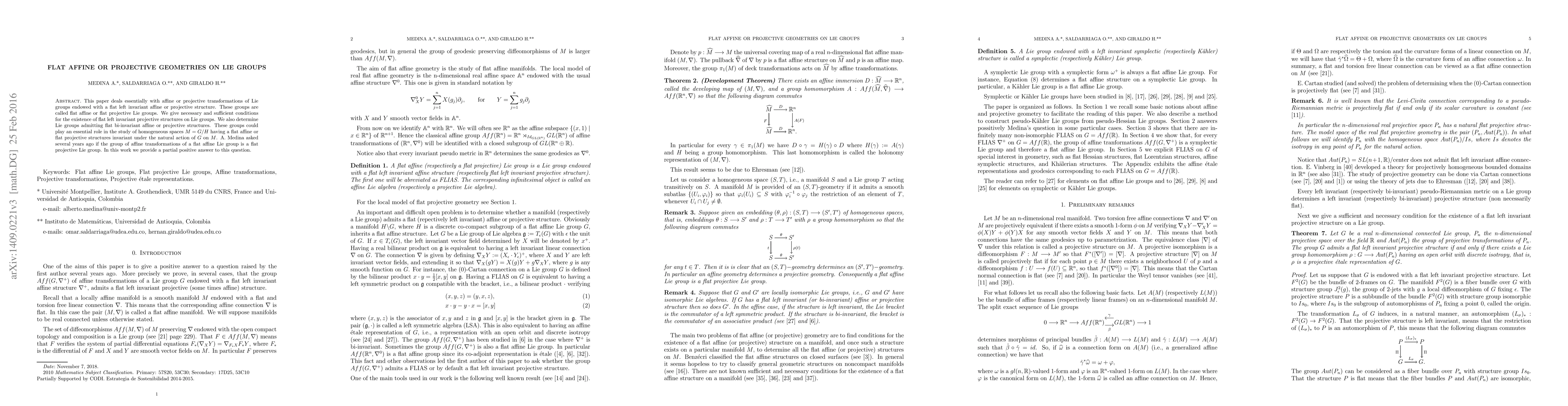 This paper identifies Lie groups that support flat left invariant affine or projective structures, termed flat affine or projective Lie groups, and partially confirms A. Medina's question regarding the nature of affine transformation groups of flat affine Lie groups, showing they can be flat projective Lie groups.