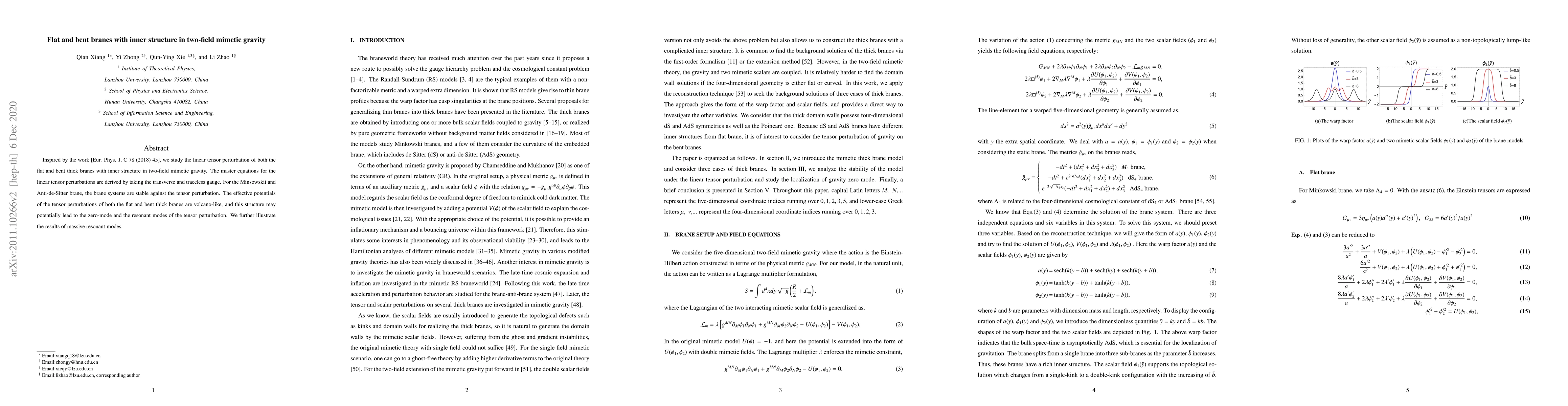 This paper investigates linear tensor perturbations in two-field mimetic gravity for flat and bent thick branes with inner structure. The study finds that both Minkowski and Anti-de-Sitter brane systems remain stable against tensor perturbations, with effective potentials exhibiting volcano-like structures that may give rise to zero-mode and resonant modes, including massive resonant modes.
