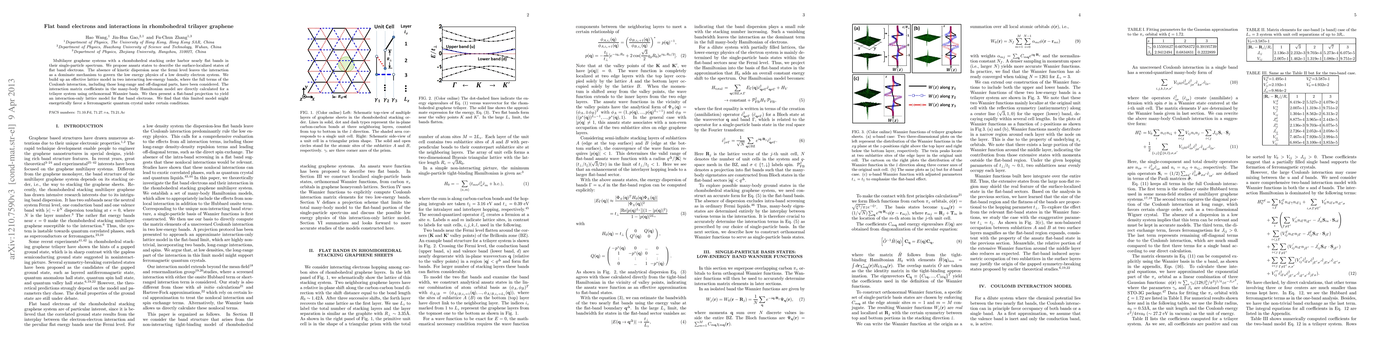 This paper investigates the nearly flat bands in rhombohedral trilayer graphene, proposing ansatz states for surface-localized electrons and developing an effective lattice model that considers full Coulomb interactions. It suggests that under certain conditions, the interactions may favor a ferromagnetic quantum crystal.