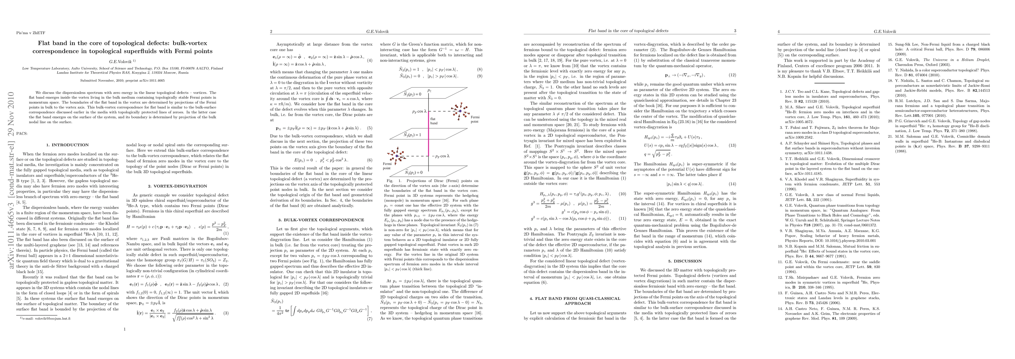 We discuss the dispersionless spectrum with zero energy in the linear topological defects - vortices. The flat band emerges inside the vortex living in the bulk medium containing topologically stable Fermi points in momentum space. The boundaries of the flat band in the vortex are determined by projections of the Fermi points in bulk to the vortex axis. This bulk-vortex correspondence for flat band is similar to the bulk-surface correspondence discussed earlier in the media with topologically protected lines of zeroes. In the latter case the flat band emerges on the surface of the system, and its boundary is determined by projection of the bulk nodal line on the surface.