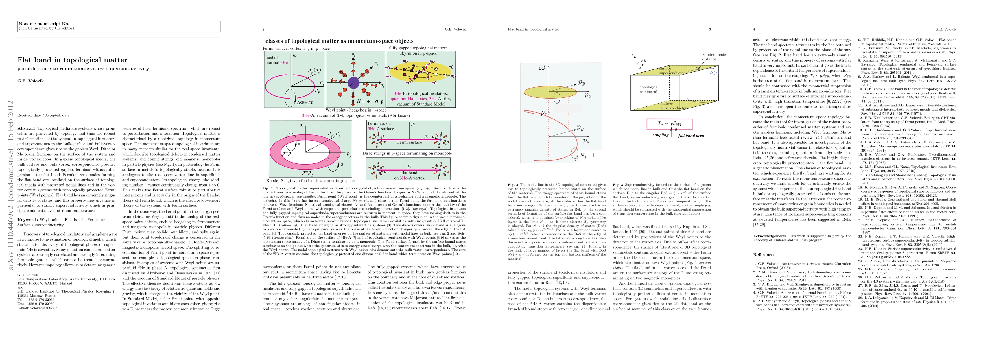 Topological media are systems whose properties are protected by topology and thus are robust to deformations of the system. In topological insulators and superconductors the bulk-surface and bulk-vortex correspondence gives rise to the gapless Weyl, Dirac or Majorana fermions on the surface of the system and inside vortex cores. In gapless topological media, the bulk-surface and bulk-vortex correspondence produce topologically protected gapless fermions without dispersion - the flat band. Fermion zero modes forming the flat band are localized on the surface of topological media with protected nodal lines and in the vortex core in systems with topologically protected Fermi points (Weyl points). Flat band has an extremely singular density of states, and this property may give rise in particular to surface superconductivity which in principle could exist even at room temperature.