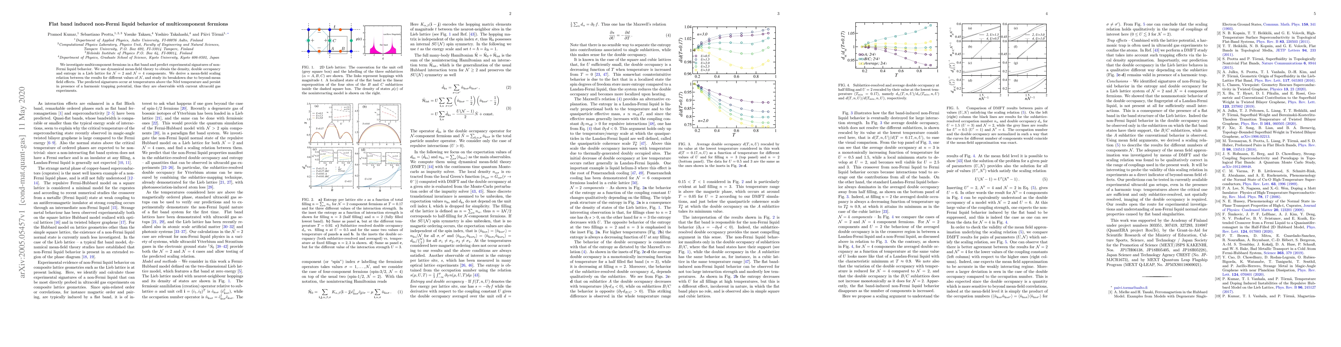 We investigate multicomponent fermions in a flat band and predict experimental signatures of non-Fermi liquid behavior. We use dynamical mean-field theory to obtain the density, double occupancy and entropy in a Lieb lattice for $\mathcal{N} = 2$ and $\mathcal{N} = 4$ components. We derive a mean-field scaling relation between the results for different values of $\mathcal{N}$, and study its breakdown due to beyond-mean field effects. The predicted signatures occur at temperatures above the N\'eel temperature and persist in presence of a harmonic trapping potential, thus they are observable with current ultracold gas experiments.