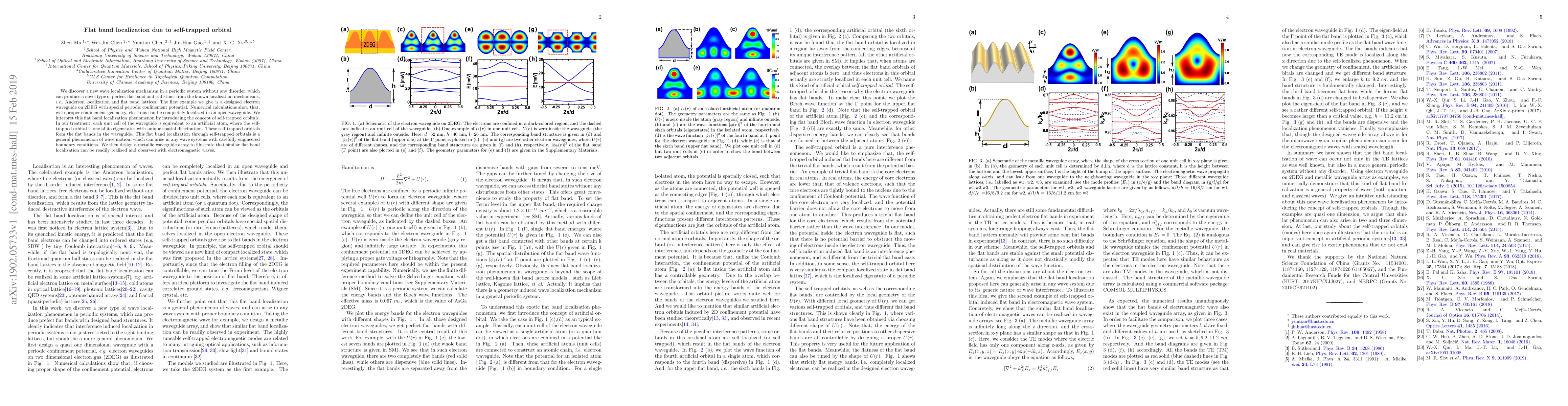 This paper presents a novel wave localization mechanism in a periodic system without disorder, termed flat band localization due to self-trapped orbitals. This mechanism, distinct from Anderson localization, produces a perfect flat band in a designed electron waveguide, demonstrating complete electron localization in an open waveguide through carefully engineered boundary conditions.