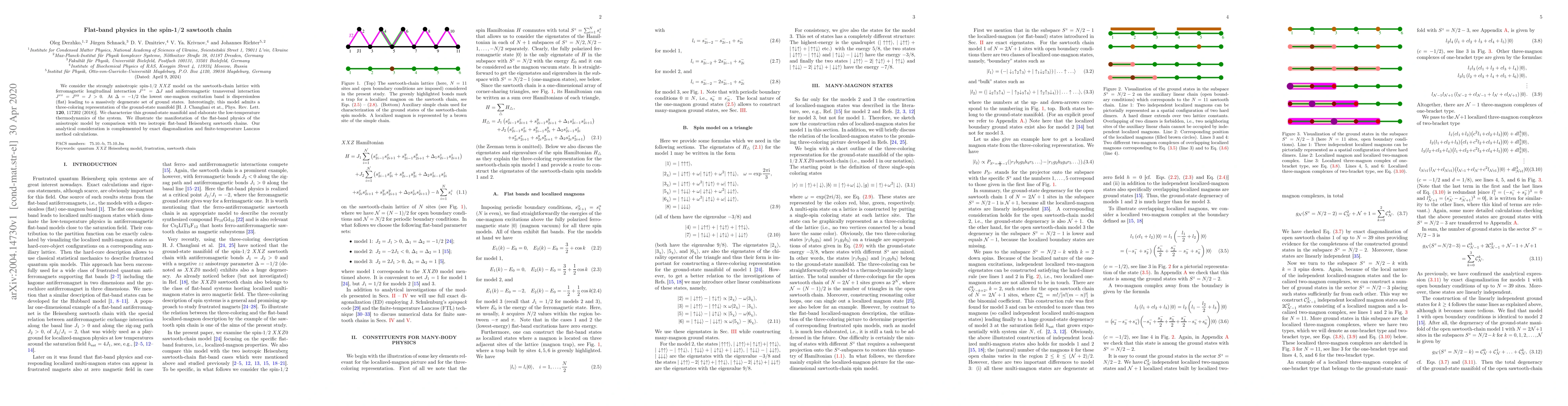 This paper investigates the spin-1/2 $XXZ$ model on a sawtooth chain lattice, revealing a flat-band phenomenon at $\Delta=-1/2$ that results in a highly degenerate ground state manifold. The study characterizes this manifold and explores its low-temperature thermodynamic properties, supported by analytical, exact diagonalization, and finite-temperature calculations.