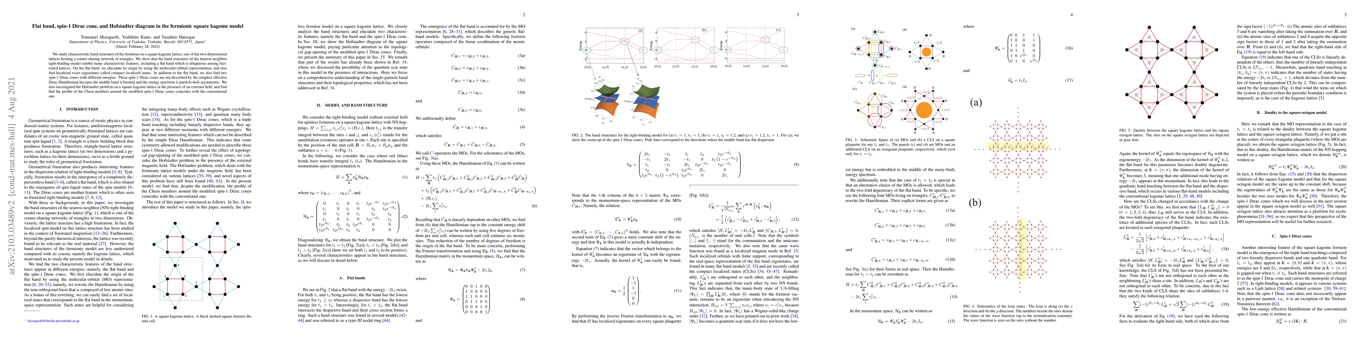 We study characteristic band structures of the fermions on a square kagome lattice, one of the two-dimensional lattices hosting a corner-sharing network of triangles. We show that the band structures of the nearest-neighbor tight-binding model exhibit many characteristic features, including a flat band which is ubiquitous among frustrated lattices. On the flat band, we elucidate its origin by using the molecular-orbital representation and also find localized exact eigenstates called compact localized states. In addition to the flat band, we also find two spin-1 Dirac cones with different energies. These spin-1 Dirac cones are not described by the simplest effective Dirac Hamiltonian because the middle band is bended and the energy spectrum is particle-hole asymmetric. We also investigated the Hofstadter problem on a square kagome lattice in the presence of an external field and find that the profile of the Chern numbers around the modified spin-1 Dirac cones coincides with the conventional one.