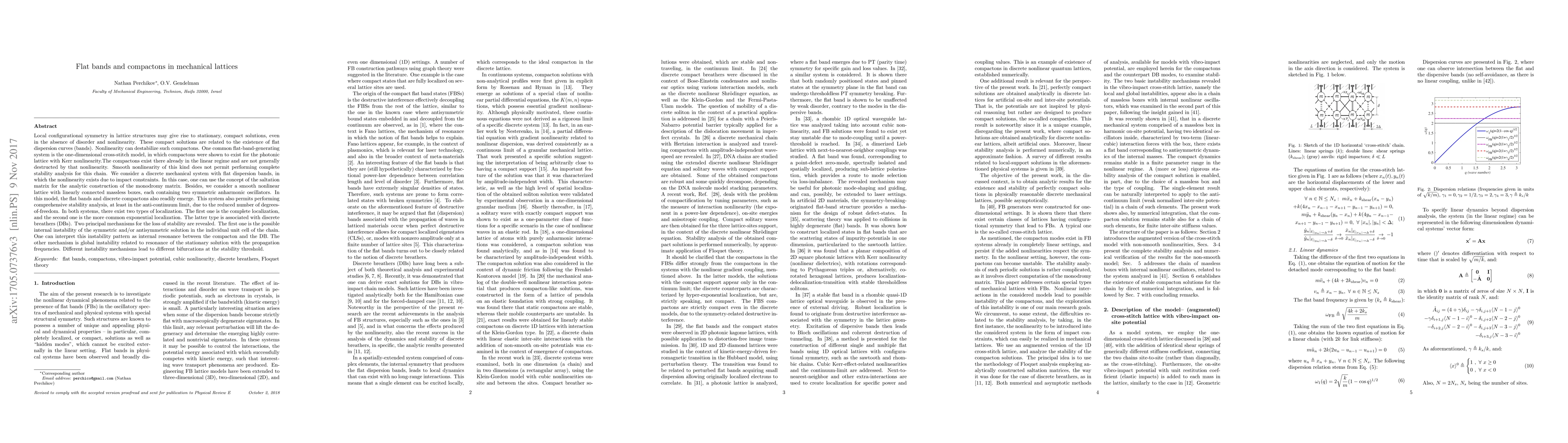 Local configurational symmetry in lattice structures may give rise to stationary, compact solutions, even in the absence of disorder and nonlinearity. These compact solutions are related to the existence of flat dispersion curves (bands). Nonlinearity can destabilize such compactons. One common flat-band-generating system is the 1D cross-stitch model, in which compactons were shown to exist for the photonic lattice with Kerr nonlinearity. The compactons exist there already in the linear regime and are not generally destructed by that nonlinearity. Smooth nonlinearity of this kind does not allow doing a complete stability analysis for this chain. We consider a discrete mechanical system with flat dispersion bands, in which the nonlinearity exists due to impact constraints. There, one can use the concept of the saltation matrix for the analytic construction of the monodromy matrix. Besides, we consider a smooth nonlinear lattice with linearly connected massless boxes, each containing two symmetric anharmonic oscillators. In this model, the flat bands and discrete compactons also readily emerge. This system also permits performing comprehensive stability analysis, at least in the anti-continuum limit, due to the reduced number of degrees-of-freedom. In both systems, there exist two types of localization. The first one is the complete localization, and the second one is the more common exponential localization. The latter type is associated with discrete breathers (DBs). Two principal mechanisms for the loss of stability are revealed. The first one is the possible internal instability of the symmetric and/or antisymmetric solution in the individual unit cell of the chain. One can interpret this instability pattern as internal resonance between the compacton and the DB. The other mechanism is global instability related to resonance of the stationary solution with the propagation frequencies.
