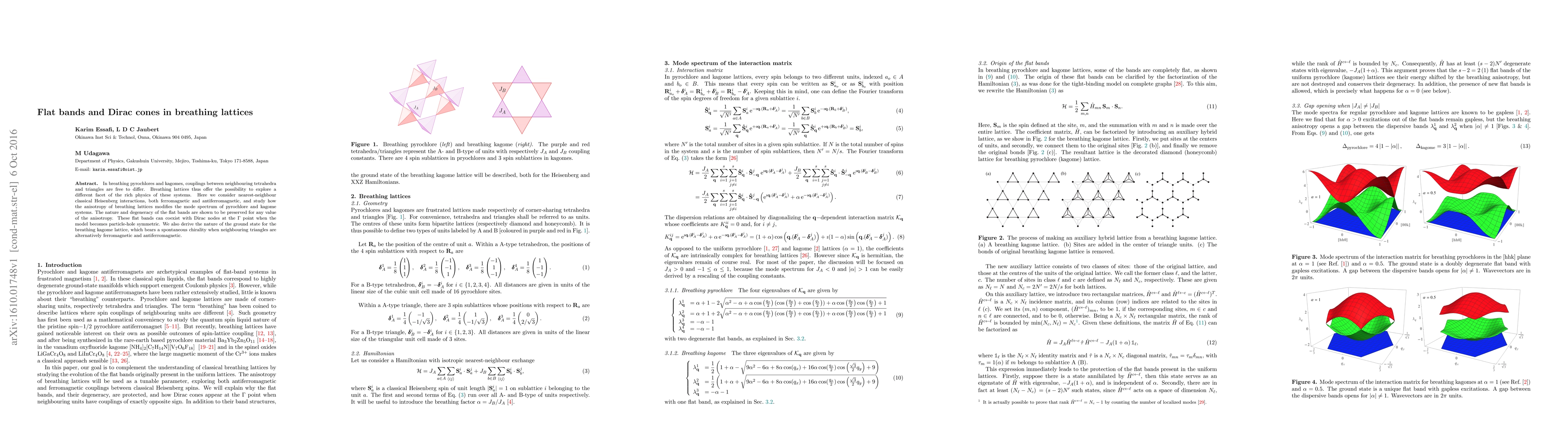 This paper explores the physics of breathing pyrochlores and kagomes, revealing that flat bands and Dirac cones can emerge due to the anisotropic couplings in these lattices. The study finds that the presence of flat bands is robust against anisotropy, and they can coexist with Dirac nodes under particle-hole symmetry, leading to a chiral ground state in the breathing kagome lattice.