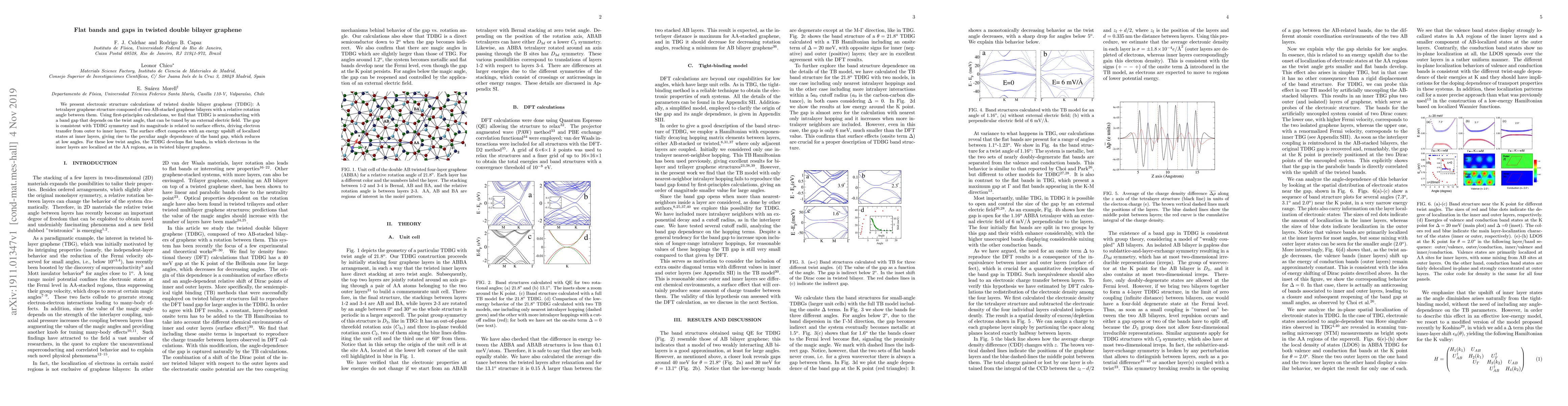 This paper investigates the electronic structure of twisted double bilayer graphene (TDBG), revealing it to be semiconducting with a tunable band gap dependent on the twist angle. The band gap's behavior is influenced by surface effects and localized states, leading to flat bands at low twist angles.