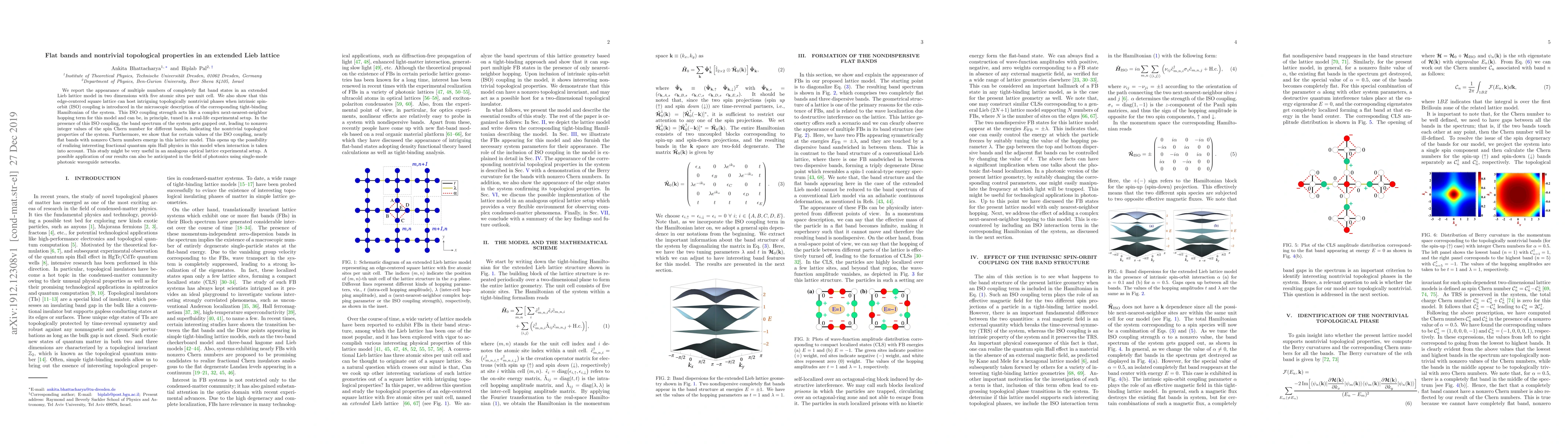 We report the appearance of multiple numbers of completely flat band states in an extended Lieb lattice model in two dimensions with five atomic sites per unit cell. We also show that this edge-centered square lattice can host intriguing topologically nontrivial phases when intrinsic spin-orbit (ISO) coupling is introduced in the microscopic description of the corresponding tight-binding Hamiltonian of the system. This ISO coupling strength acts like a complex next-nearest-neighbor hopping term for this model and can be, in principle, tuned in a real-life experimental setup. In the presence of this ISO coupling, the band spectrum of the system gets gapped out, leading to nonzero integer values of the spin Chern number for different bands, indicating the nontrivial topological properties of the system. Furthermore, we show that for certain values of the ISO coupling, nearly flat bands with nonzero Chern numbers emerge in this lattice model. This opens up the possibility of realizing interesting fractional quantum spin Hall physics in this model when interaction is taken into account. This study might be very useful in an analogous optical lattice experimental setup. A possible application of our results can also be anticipated in the field of photonics using single-mode photonic waveguide networks.