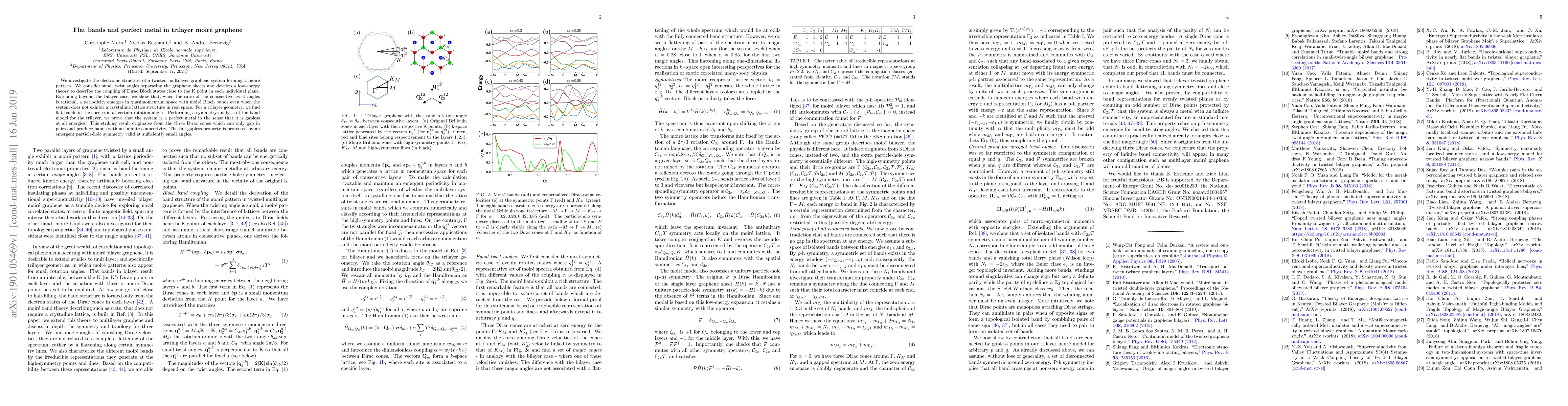 This paper investigates the electronic structure of trilayer moiré graphene, revealing flat bands and demonstrating the system's perfect metal behavior due to the three Dirac cones that can only gap in pairs, maintaining an infinite connectivity and emergent particle-hole symmetry.