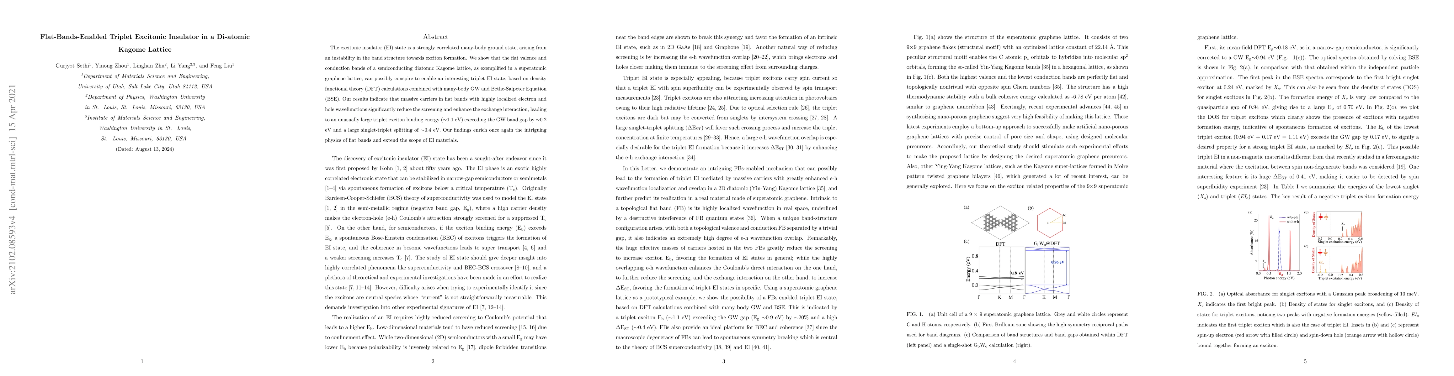 The excitonic insulator (EI) state is a strongly correlated many-body ground state, arising from an instability in the band structure towards exciton formation. We show that the flat valence and conduction bands of a semiconducting diatomic Kagome lattice, as exemplified in a superatomic graphene lattice, can possibly conspire to enable an interesting triplet EI state, based on density functional theory (DFT) calculations combined with many-body GW and Bethe-Salpeter Equation(BSE). Our results indicate that massive carriers in flat bands with highly localized electron and hole wavefunctions significantly reduce the screening and enhance the exchange interaction, leading to an unusually large triplet exciton binding energy (~1.1 eV) exceeding the GW band gap by ~0.2 eV and a large singlet-triplet splitting of ~0.4 eV. Our findings enrich once again the intriguing physics of flat bands and extend the scope of EI materials.