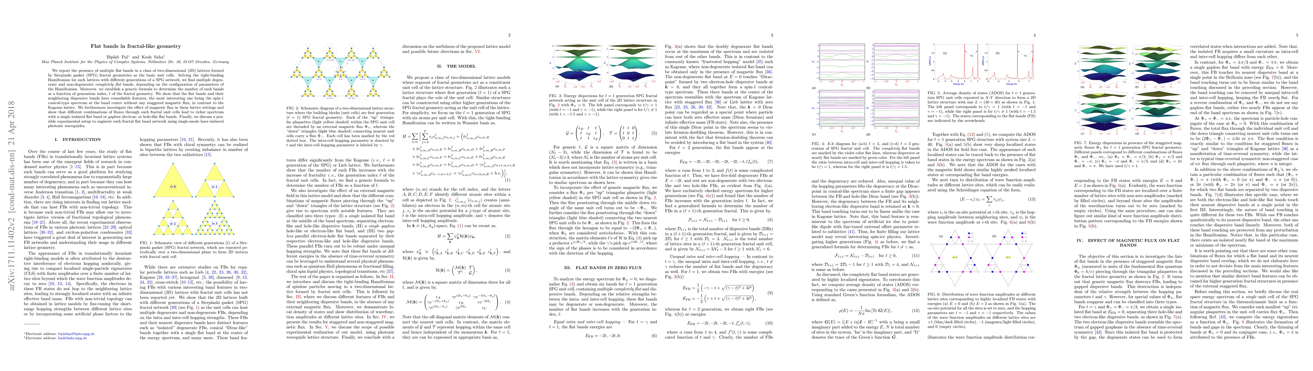We report the presence of multiple flat bands in a class of two-dimensional (2D) lattices formed by Sierpinski gasket (SPG) fractal geometries as the basic unit cells. Solving the tight-binding Hamiltonian for such lattices with different generations of a SPG network, we find multiple degenerate and non-degenerate completely flat bands, depending on the configuration of parameters of the Hamiltonian. Moreover, we find a generic formula to determine the number of such bands as a function of the generation index $\ell$ of the fractal geometry. We show that the flat bands and their neighboring dispersive bands have remarkable features, the most interesting one being the spin-1 conical-type spectrum at the band center without any staggered magnetic flux, in contrast to the Kagome lattice. We furthermore investigate the effect of the magnetic flux in these lattice settings and show that different combinations of fluxes through such fractal unit cells lead to richer spectrum with a single isolated flat band or gapless electron- or hole-like flat bands. Finally, we discuss a possible experimental setup to engineer such fractal flat band network using single-mode laser-induced photonic waveguides.