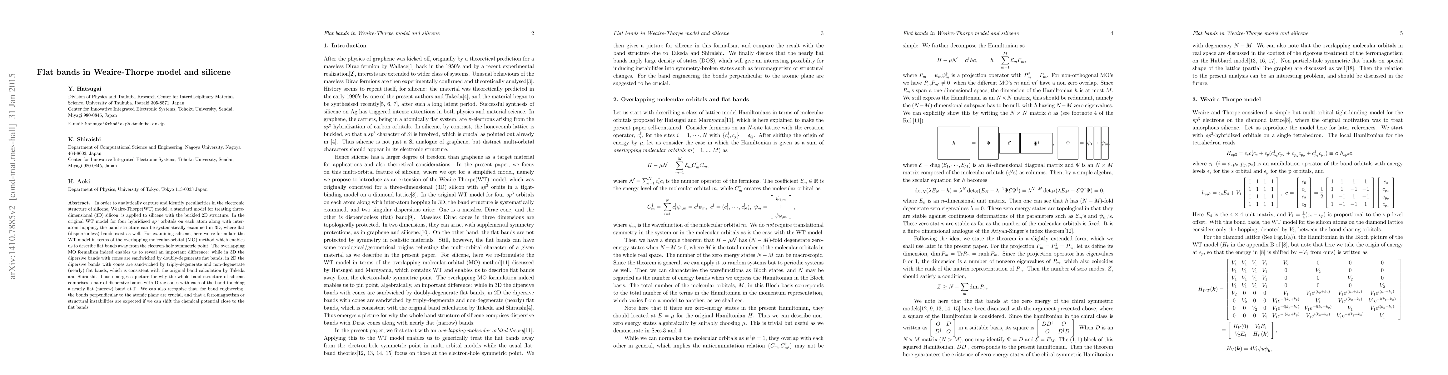 This paper applies the Weaire-Thorpe model to silicene, revealing that unlike 3D silicon, 2D silicene features triply-degenerate and non-degenerate nearly flat bands between dispersive bands, which is vital for understanding its electronic structure and potential for band engineering.