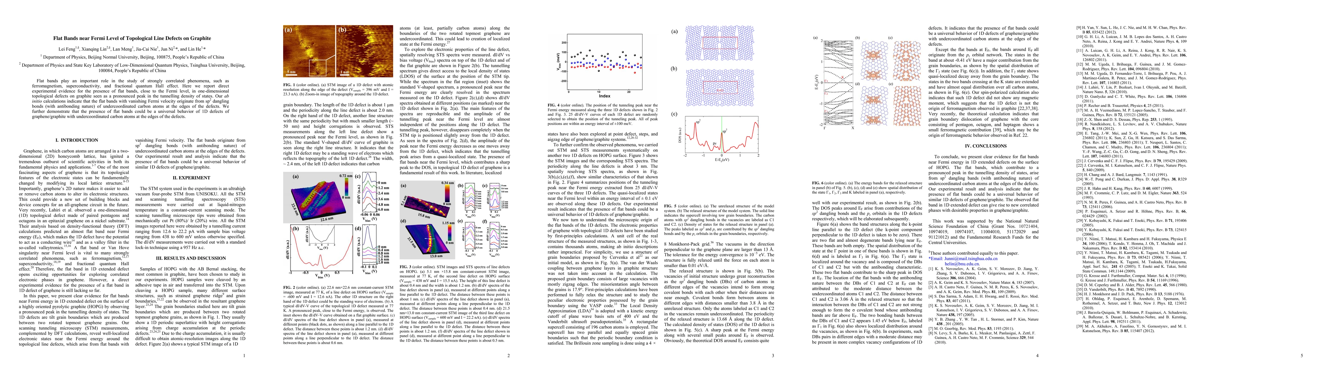 This paper presents experimental evidence for the existence of flat bands near the Fermi level in one-dimensional topological defects on graphite, observed as a peak in the tunnelling density of states. Theoretical calculations suggest these flat bands arise from sp2 dangling bonds of undercoordinated carbon atoms, indicating a universal behavior for such defects in graphene/graphite.