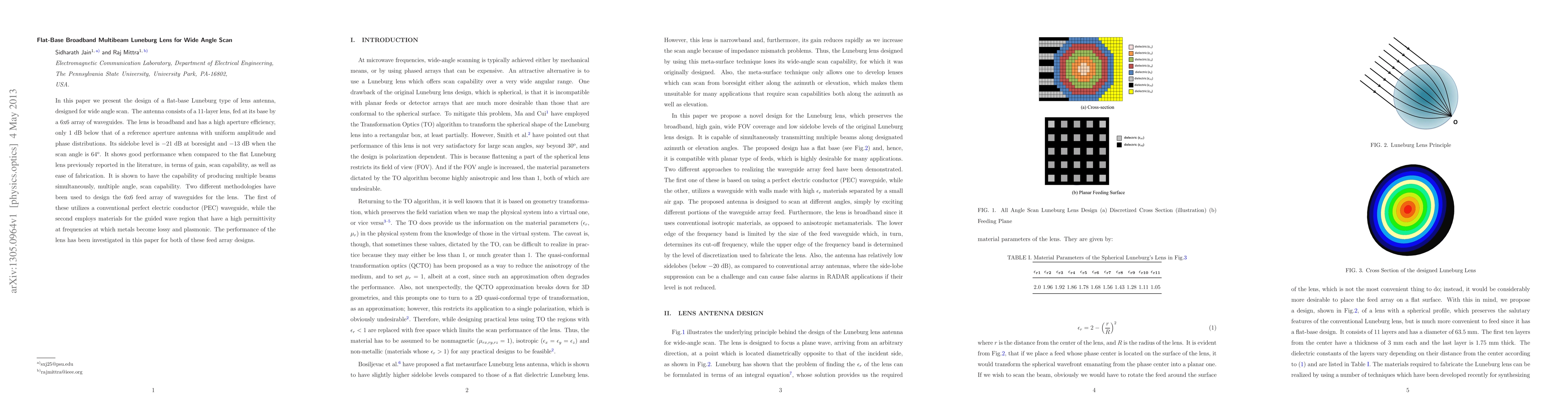 In this paper we present the design of a flat-base Luneburg type of lens antenna, designed for wide angle scan. The antenna consists of a 11-layer lens, fed at its base by a 6x6 array of waveguides. The lens is broadband and has a high aperture efficiency, only 1 dB below that of a reference aperture antenna with uniform amplitude and phase distributions. Its sidelobe level is -21 dB at boresight and -13 dB when the scan angle is 64 degrees. It shows good performance when compared to the flat Luneburg lens previously reported in the literature, in terms of gain, scan capability, as well as ease of fabrication. It is shown to have the capability of producing multiple beams simultaneously, multiple angle, scan capability. Two different methodologies have been used to design the 6x6 feed array of waveguides for the lens. The first of these utilizes a conventional perfect electric conductor (PEC) waveguide, while the second employs materials for the guided wave region that have a high permittivity at frequencies at which metals become lossy and plasmonic. The performance of the lens has been investigated in this paper for both of these feed array designs.