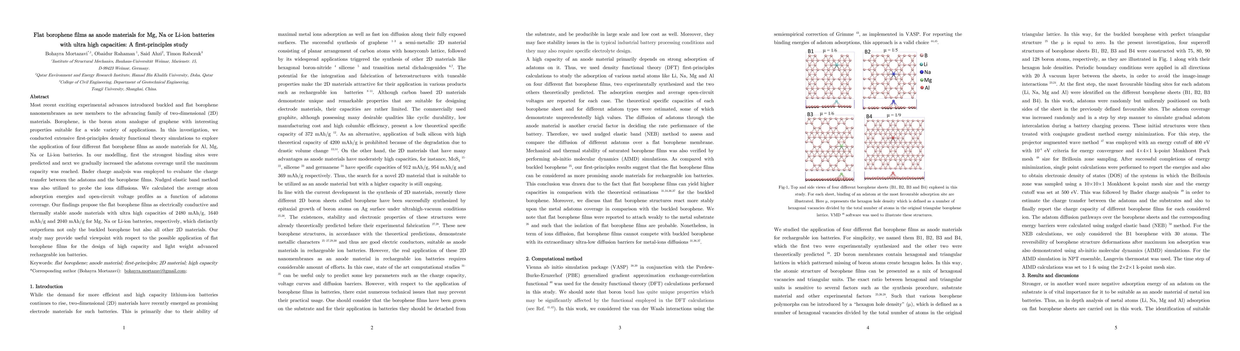 This research employs first-principles density functional theory to investigate the potential of flat borophene films as anode materials for Mg, Na, or Li-ion batteries, finding them to have ultra-high capacities of 2480, 1640, and 2040 mAh/g respectively, outperforming other 2D materials. The study suggests that flat borophene films could enable the design of advanced, high-capacity, lightweight batteries.