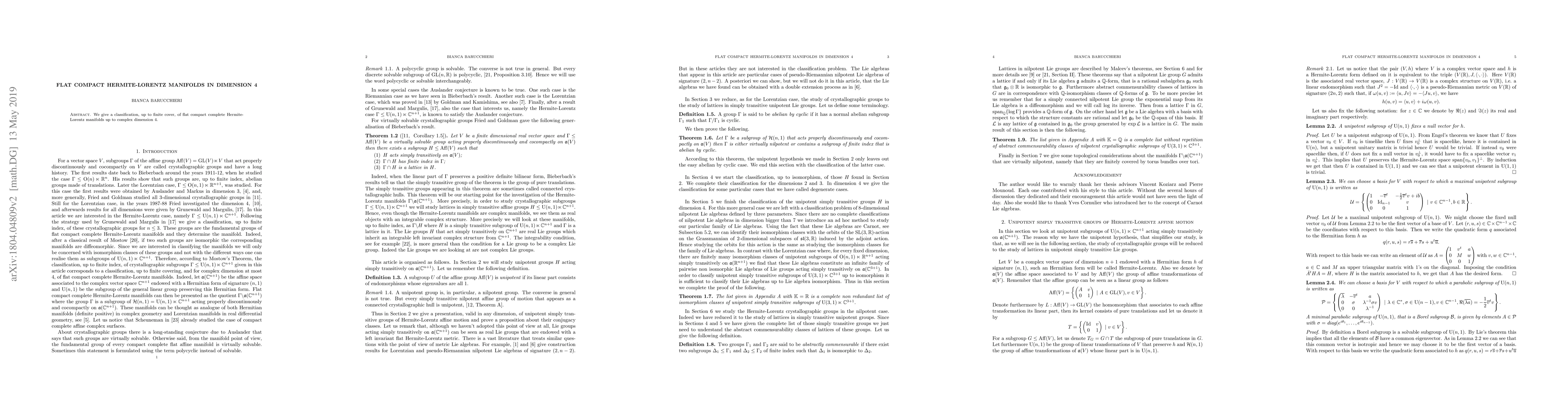 Summary: This paper classifies flat, compact, and complete Hermite-Lorentz manifolds in complex dimension 4 up to finite cover, providing a comprehensive understanding of their geometric and topological properties.