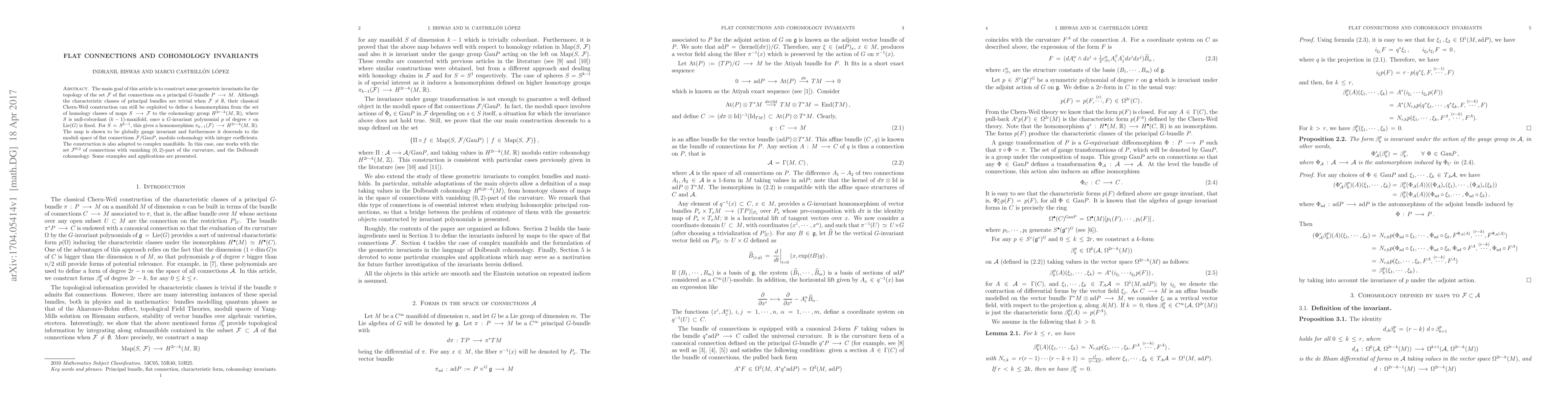 This paper constructs geometric invariants for the topology of flat connections on principal $G$-bundles, using the Chern-Weil construction to define a homomorphism from homology classes of maps to cohomology groups. The map is globally gauge invariant and descends to the moduli space of flat connections.
