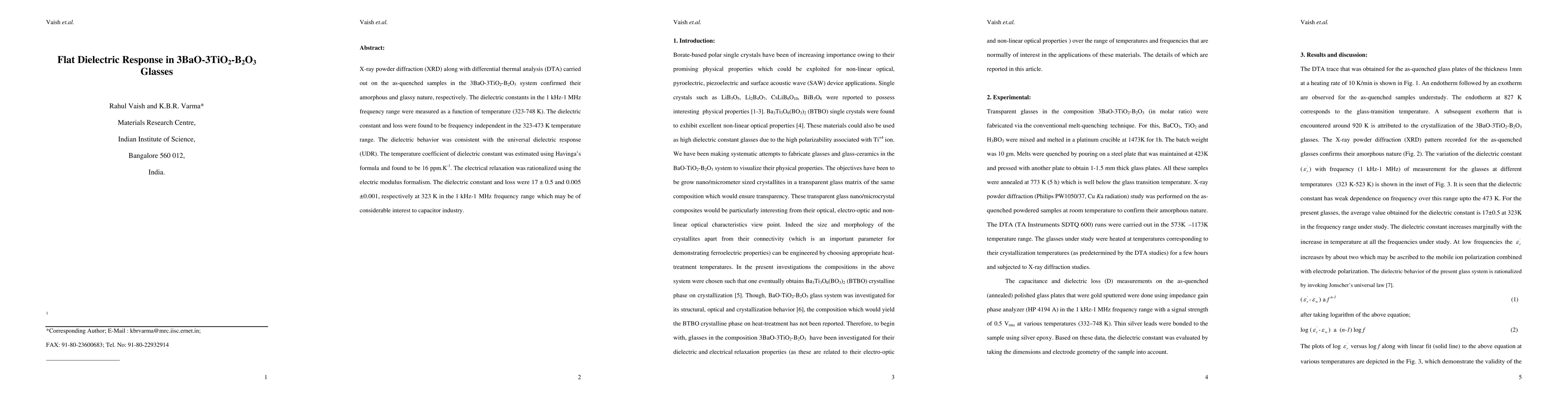 X-ray powder diffraction (XRD) along with differential thermal analysis (DTA) carried out on the as-quenched samples in the 3BaO-3TiO2-B2O3 system confirmed their amorphous and glassy nature, respectively. The dielectric constants in the 1 kHz-1 MHz frequency range were measured as a function of temperature (323-748 K). The dielectric constant and loss were found to be frequency independent in the 323-473 K temperature range. The dielectric behavior was consistent with the universal dielectric response (UDR). The temperature coefficient of dielectric constant was estimated using Havinga's formula and found to be 16 ppm.K-1. The electrical relaxation was rationalized using the electric modulus formalism. The dielectric constant and loss were 17 \pm 0.5 and 0.005 \pm 0.001, respectively at 323 K in the 1 kHz-1 MHz frequency range which may be of considerable interest to capacitor industry.