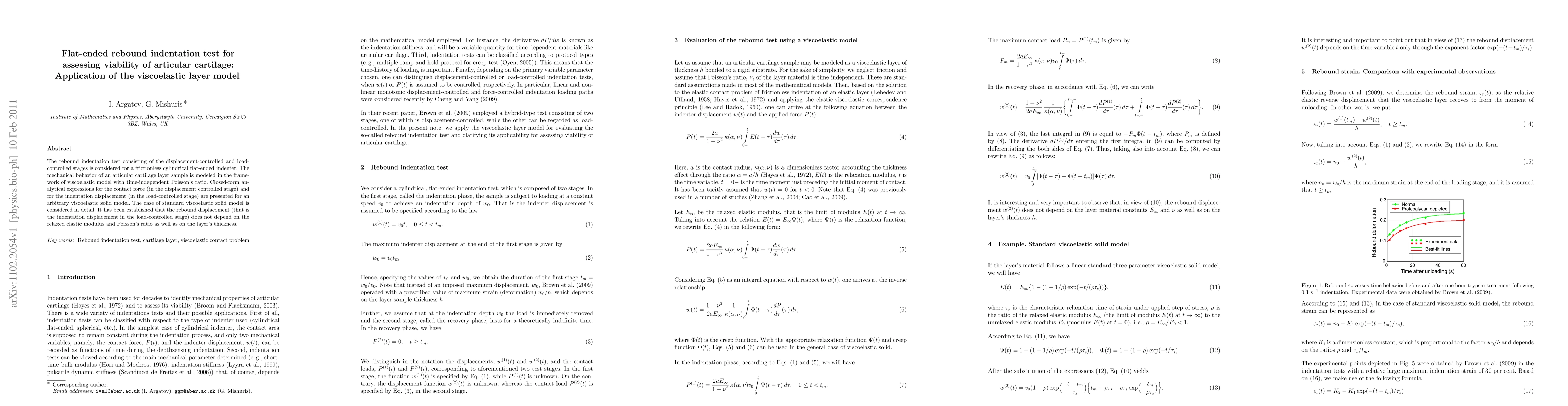 This paper develops a flat-ended rebound indentation test to assess articular cartilage's viability using a viscoelastic layer model, providing closed-form expressions for contact force and indentation displacement. The study finds that rebound displacement is independent of elastic modulus, Poisson's ratio, and layer thickness.