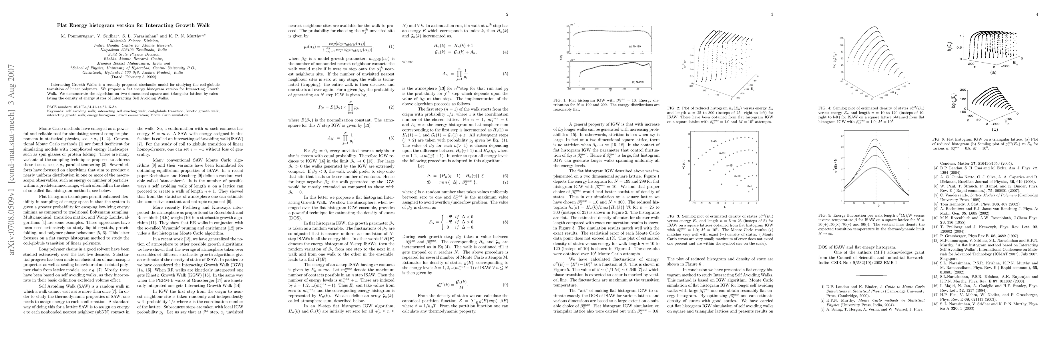 This paper proposes a flat energy histogram version for the Interacting Growth Walk model, a stochastic framework for studying polymer coil-globule transitions. The algorithm is demonstrated on two-dimensional lattices to calculate the density of energy states for Interacting Self Avoiding Walks.